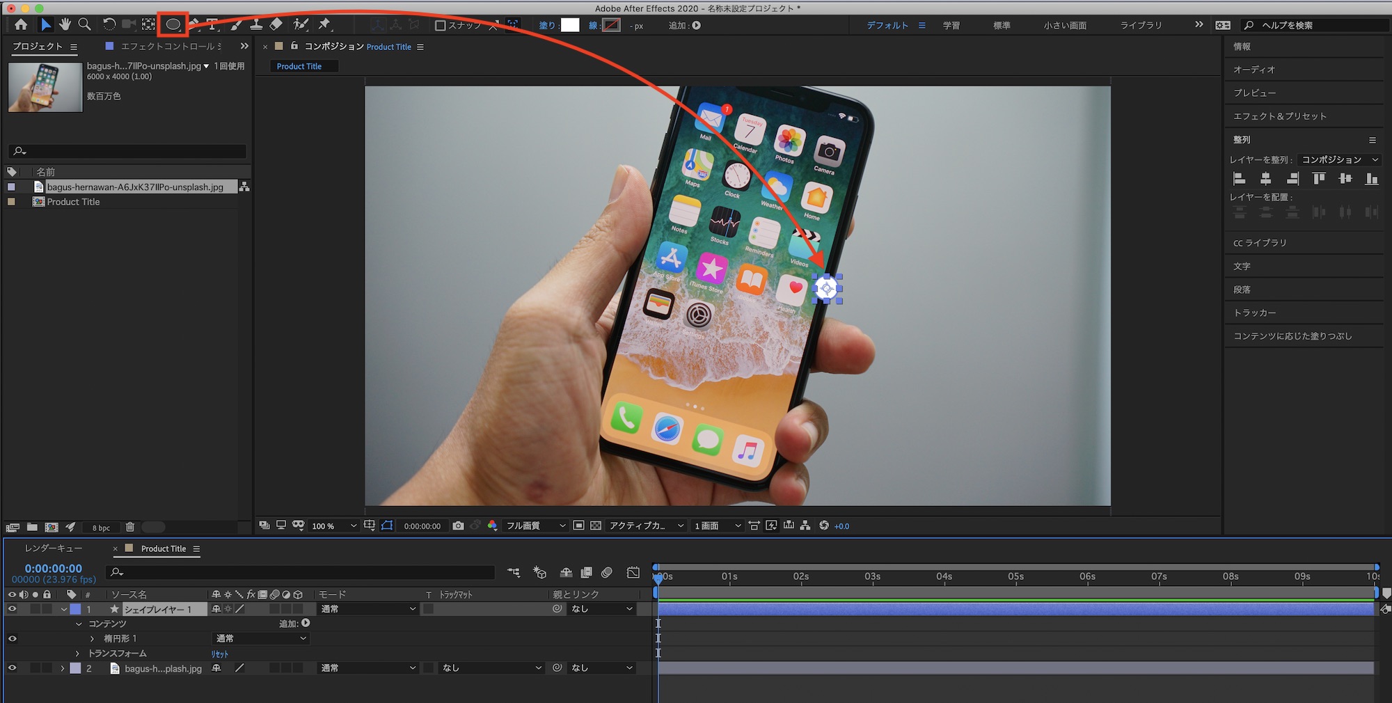 シェイプツールとテキストツールを使用してタイトルのデザインを作成していきます。まずは円形のシェイプを追加し、点として表示させたい位置に移動させます。