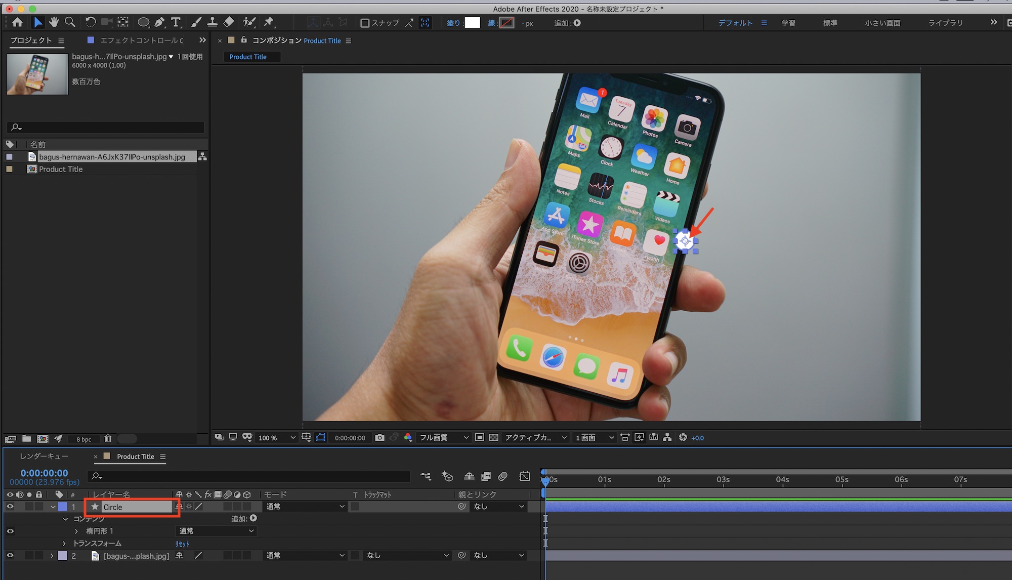 アンカーポイントを中央にして必要に応じて色などを変更し、レイヤー名を「Circle」などに変更します。