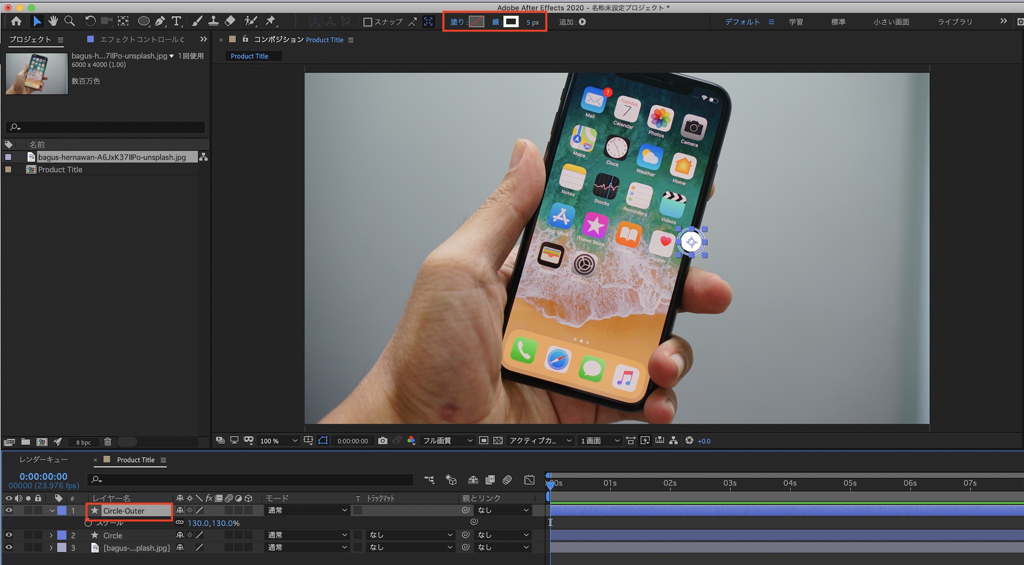 「Circle」を複製、「Circle-Outer」とレイヤー名を変更し「スケール」のプロパティを開き、数値を「130%」にします。