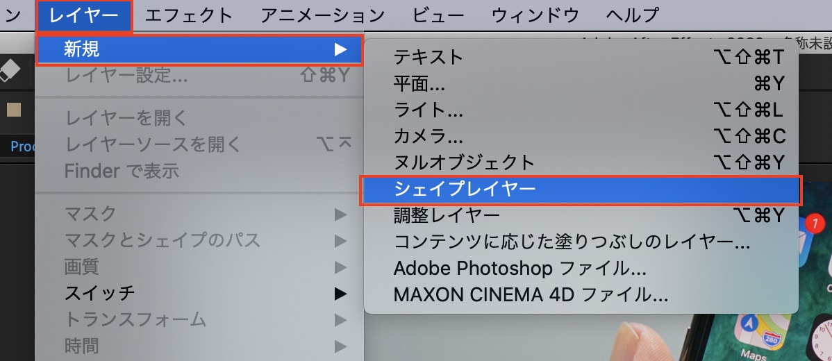 上部メニューの「レイヤー」、「新規」から「シェイプレイヤー」を選択します。