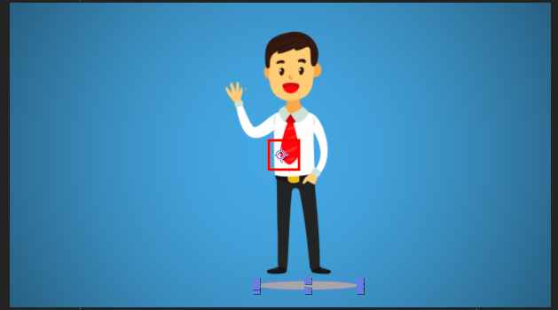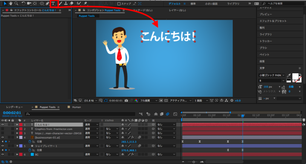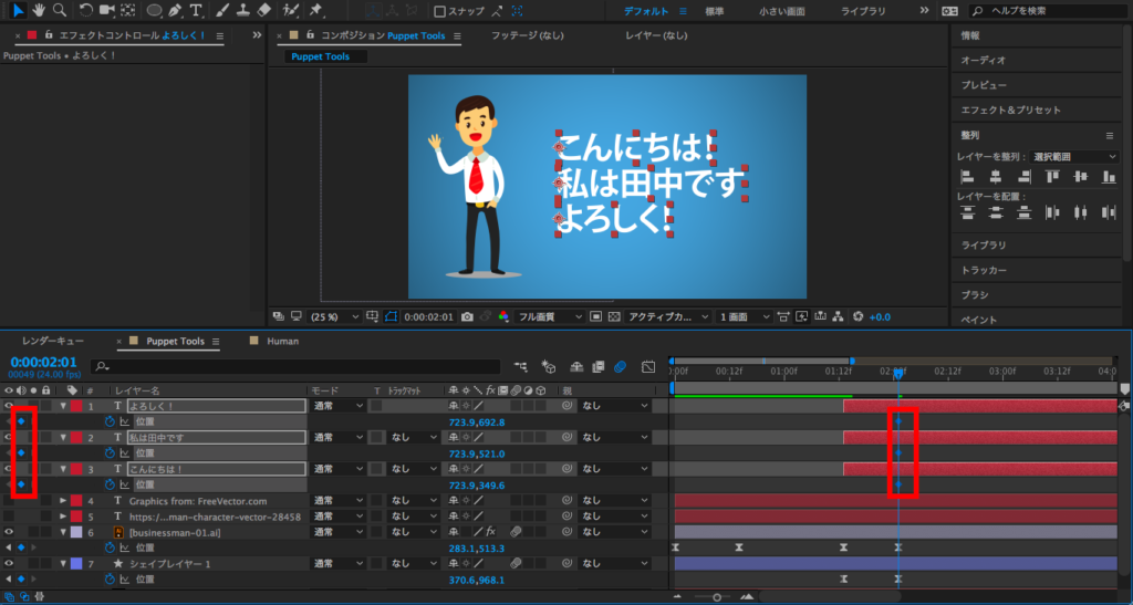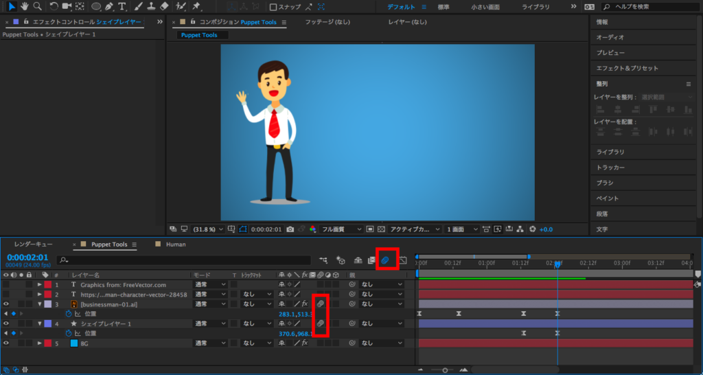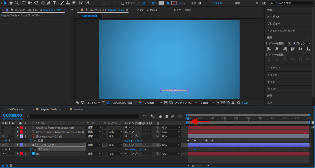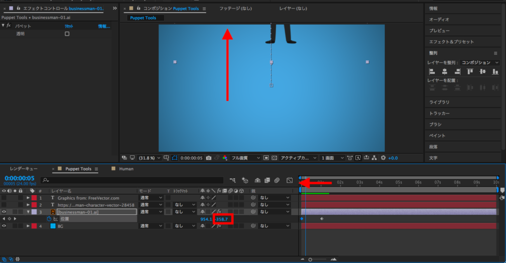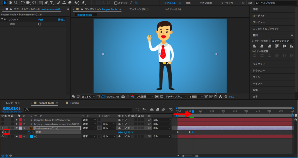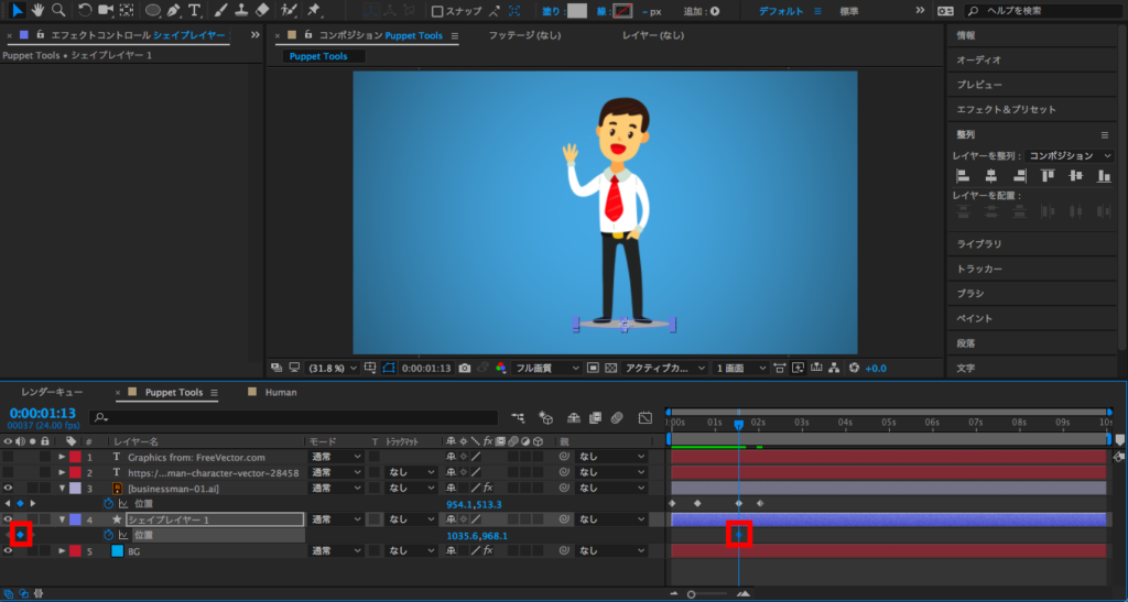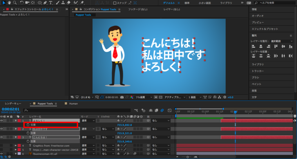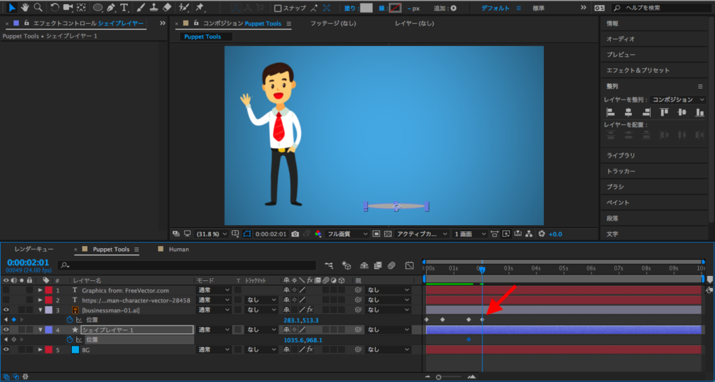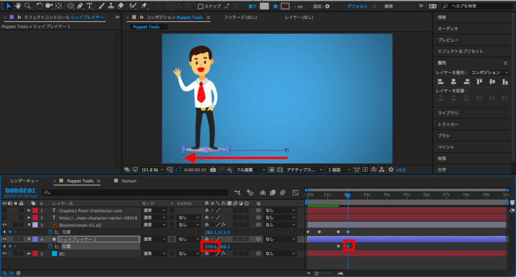 最後は2秒にタイムインディケーターを持っていって、X数値を変更するか、コンポジションでレイヤーを選択してキャラクターを画面左側に動かします。