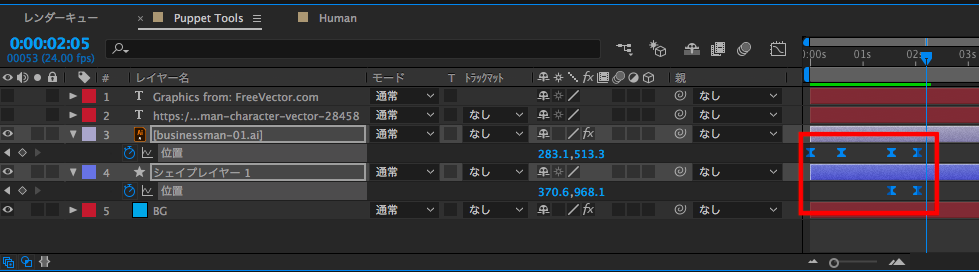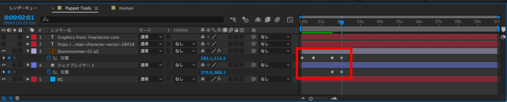 こちらも同じタイミングで動かせるようにキャラクターのレイヤーはそのままにして、同じ時間にシェイプレイヤーの位置にキーフレームを追加します。
