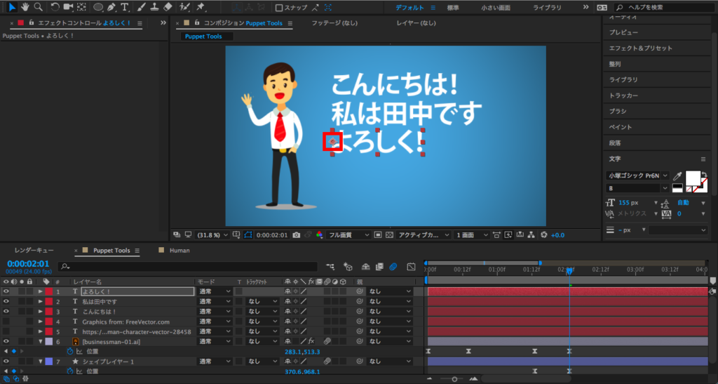 今回はそんなパペットツールで作ったアニメーションをテキストや簡単なエフェクトを追加して、自己紹介映像で使えそうなモーショングラフィックスを作ってみたいと思います。