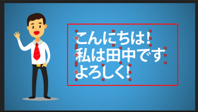 自己紹介部分であるテキストを追加してみましょう。3行に収めたかったので、「こんにちは!」、「私は田中です」、「よろしく!」のシンプルなものにしてみましょう。