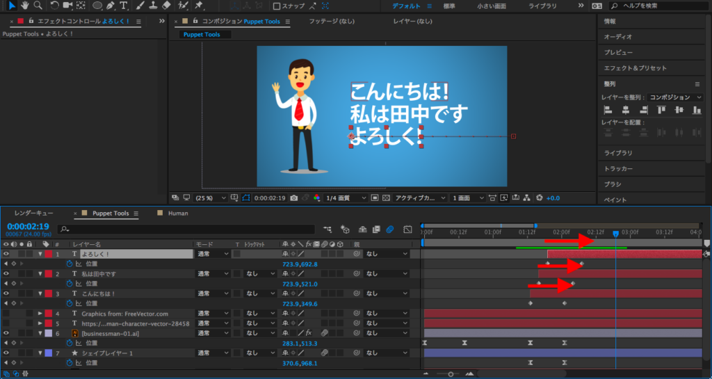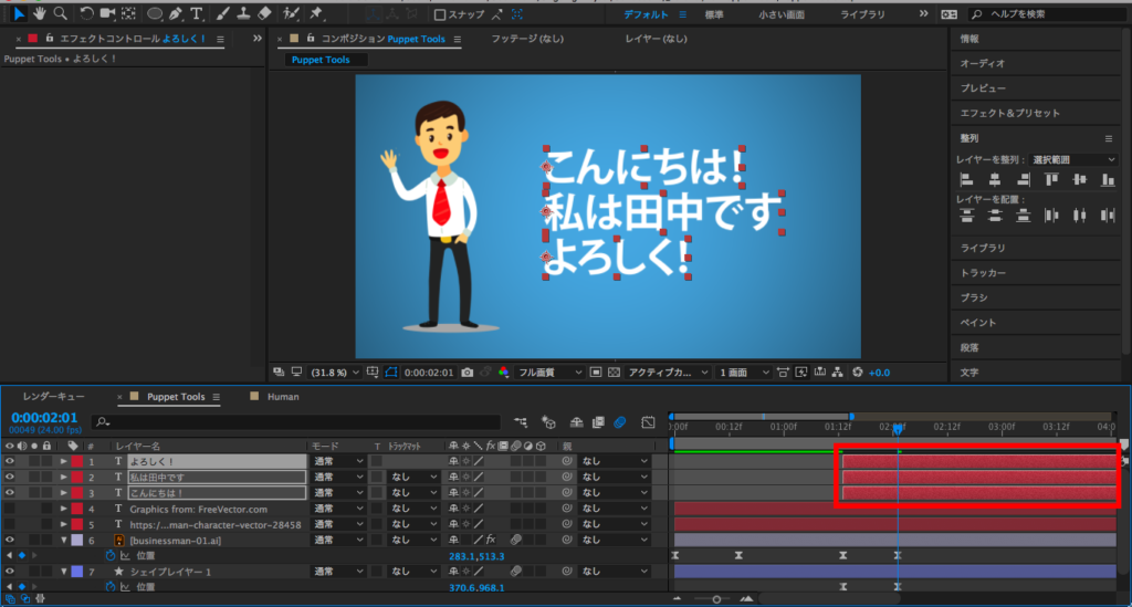テキストレイヤーの3つ全て選択して、キャラクターが左に動くタイミングで現れるように、レイヤーを移動させるか短くトリムします。