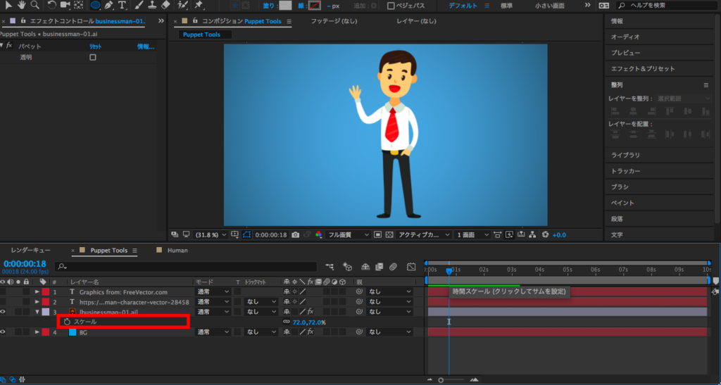 キャラクターのサイズが少し大きいので、小さくしてみましょう。Illustratorのレイヤーを選択して「スケール(ショートカット:S)」を開き、キャラクターの大きさを変更します。
