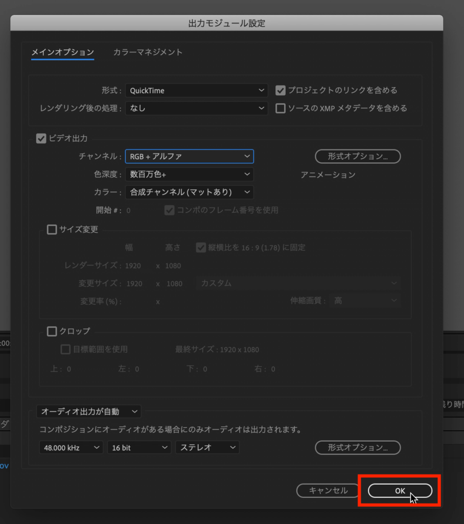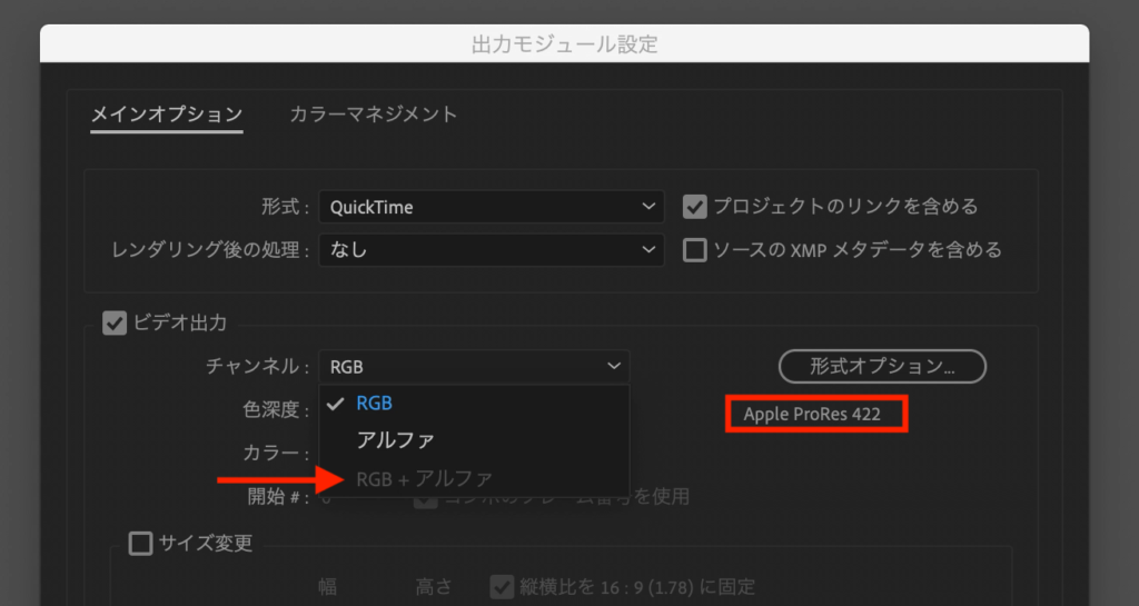 Apple ProResなどを選択した場合はこのオプションが利用できないため、背景を透明にする場合は形式オプションが「アニメーション」になっている事を確認しましょう。