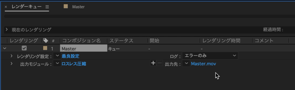 コンポジションを選択し、上部メニューにある「コンポジション」から「レンダーキューに追加」をクリックし、レンダーキュータブに追加します。
