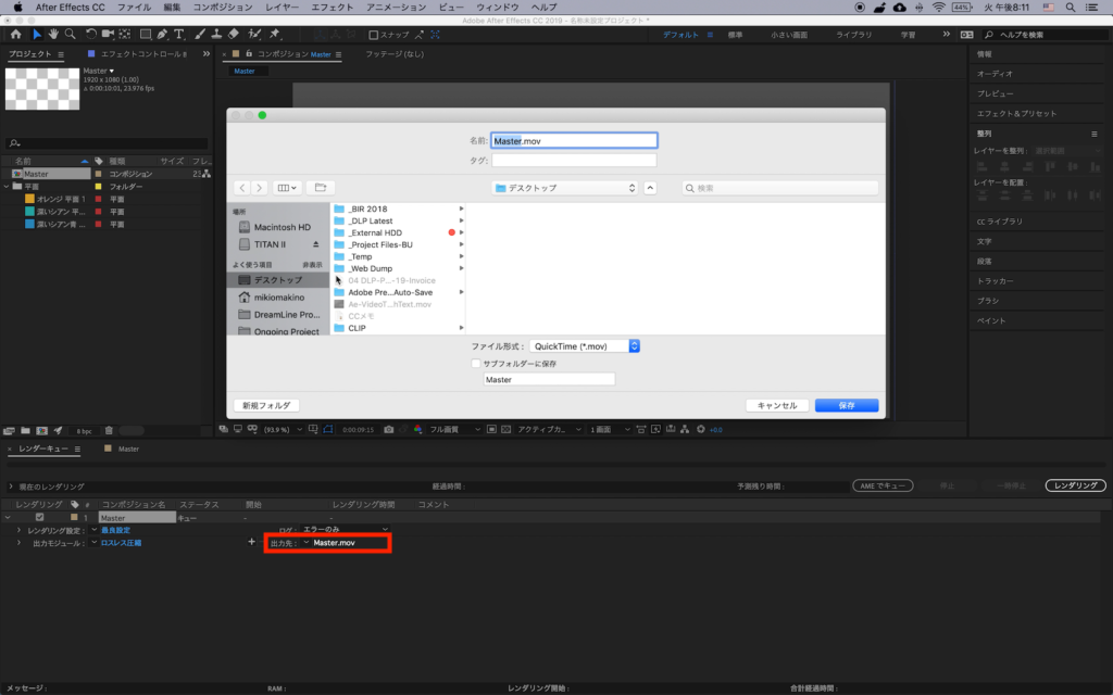 追加されたコンポジションの「出力先」をクリックして、プロジェクトの書き出し先を指定します。