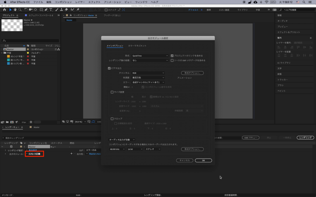 その後で「出力モジュール」にある「ロスレス圧縮」部分をクリックし、出力モジュール設定を開きます。
