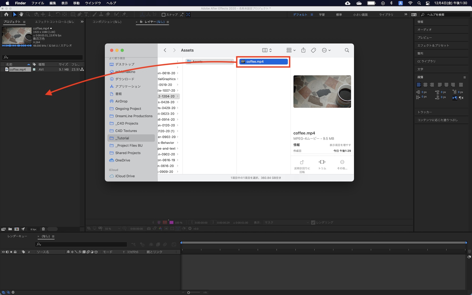 素材の追加とコンポジションの作成