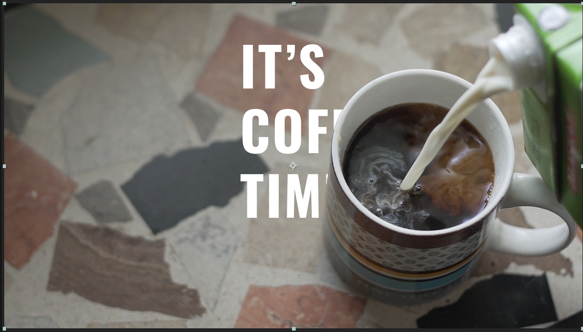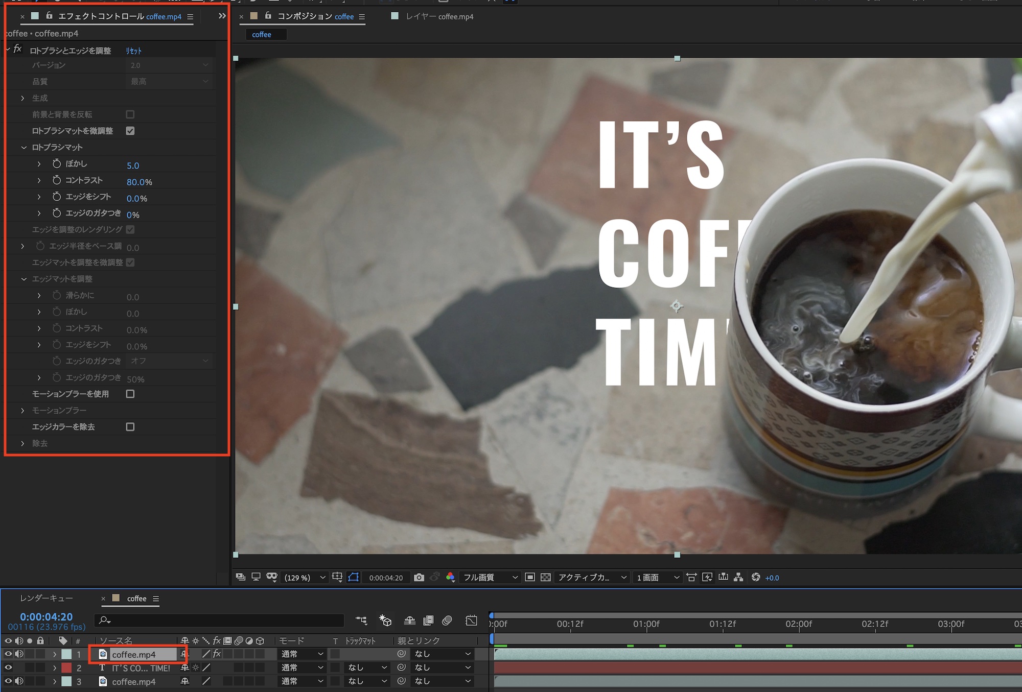 コンポジションパネルに戻り、テキストをコップと背景の間に追加していきましょう。方法は基本的にPremiere Proでのやり方と同じです。