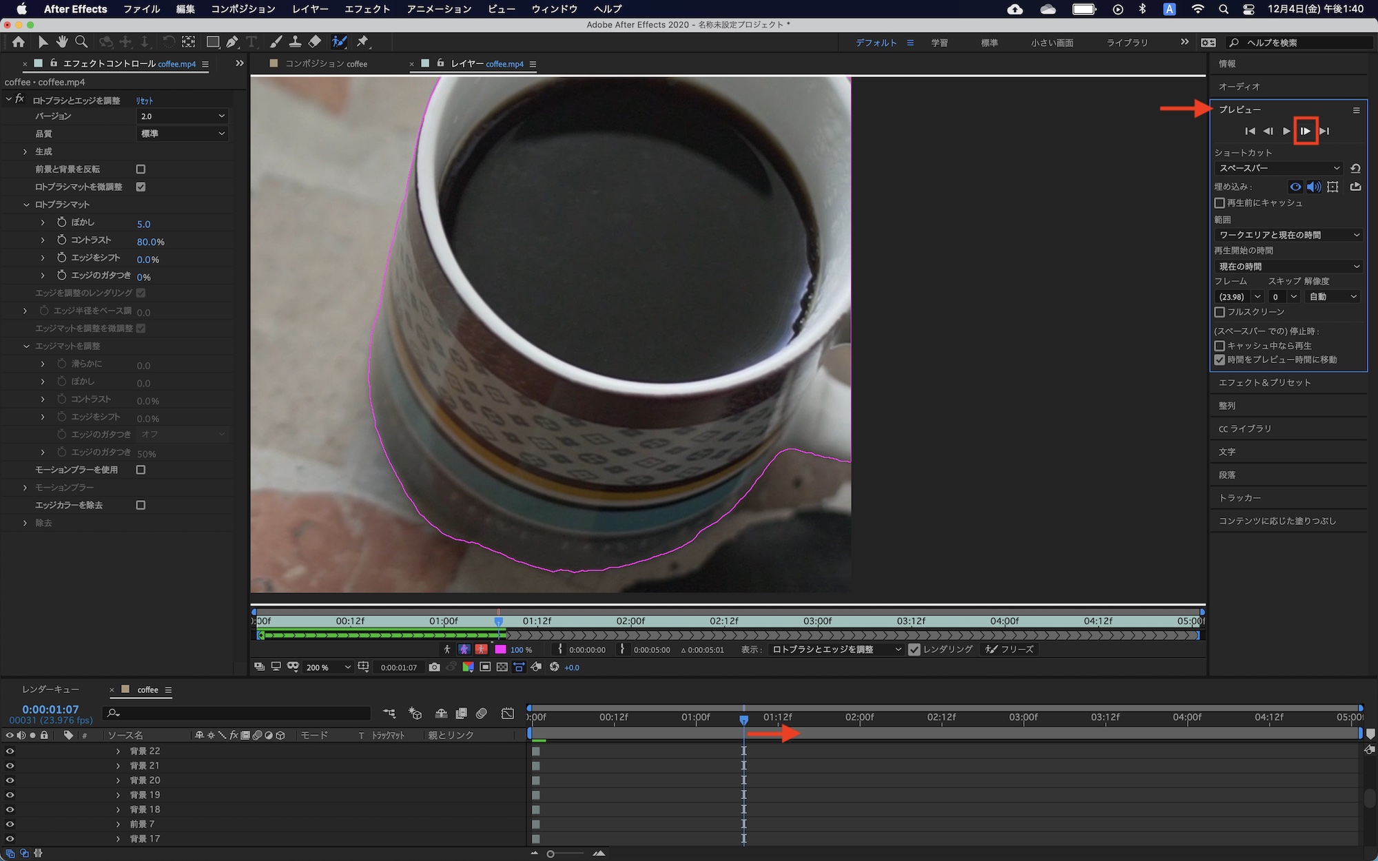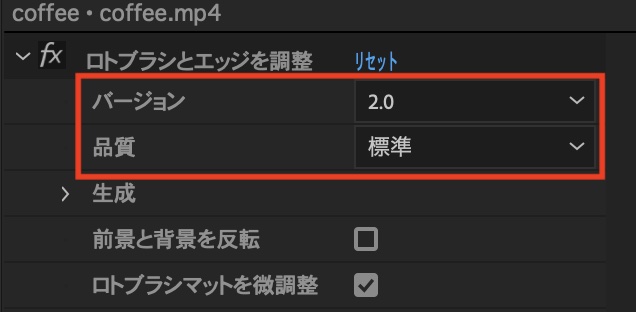 エフェクトコントロールタブではロトブラシの品質やエッジの処理といった設定が行なえます。