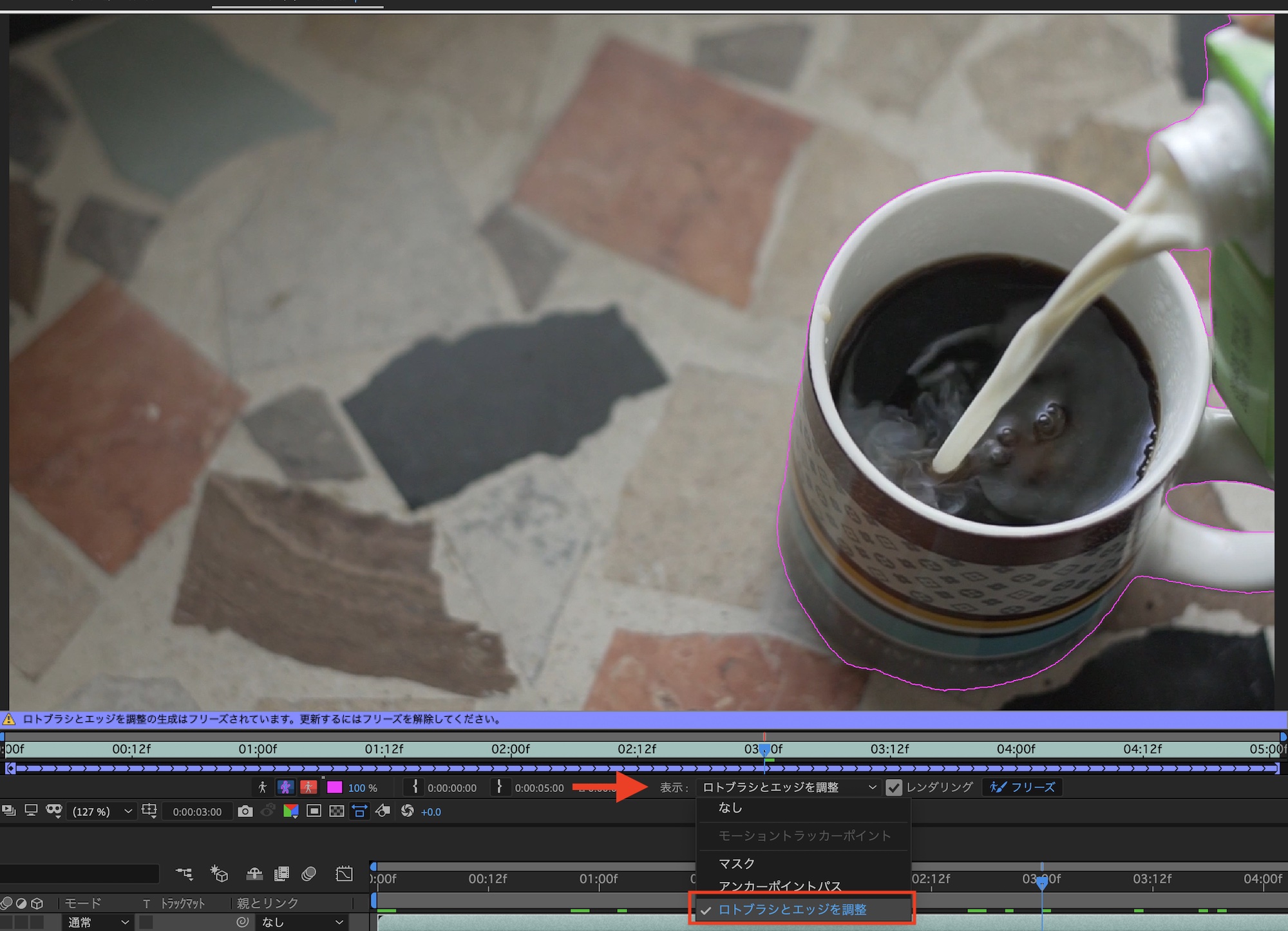 一度ロトブラシをフリーズした後で、再調整を行いたい場合はロトブラシを適用したクリップをダブルクリックして、レイヤーパネルにある「表示」から「ロトブラシとエッジを調整」を選択すると再調整が行えるようになります。
