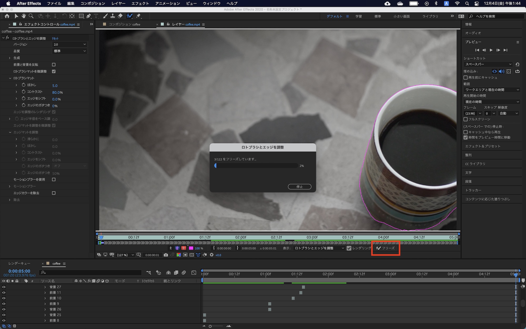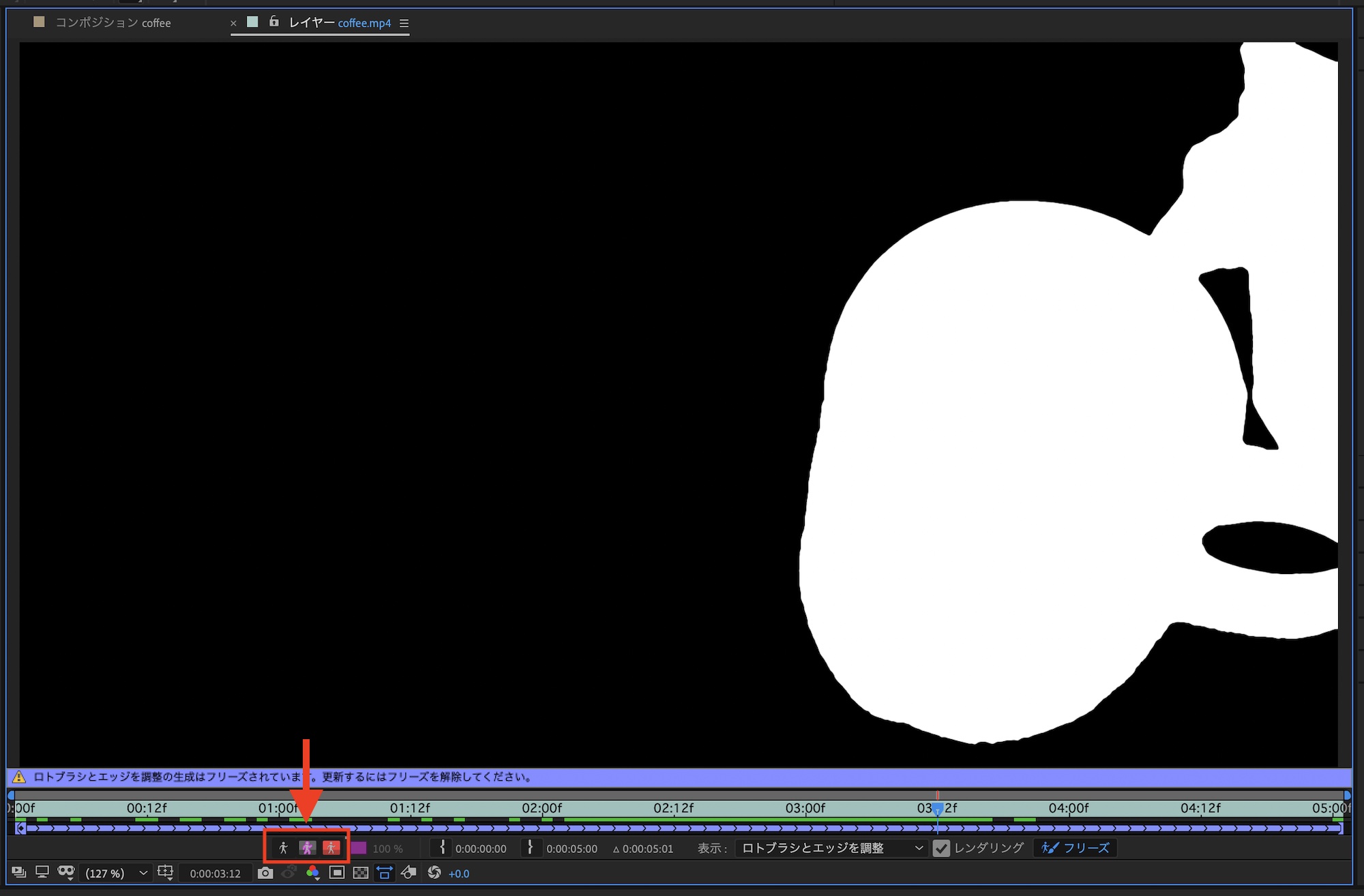 クリップの最後のフレームまでの微調整が出来たら、「フリーズ」をクリックしてロトスコープを完了させます。クリップの動きやマスクの複雑さとパソコンのスペックによって処理時間が変わりますが、筆者の環境であれば3分程度で出来ました。