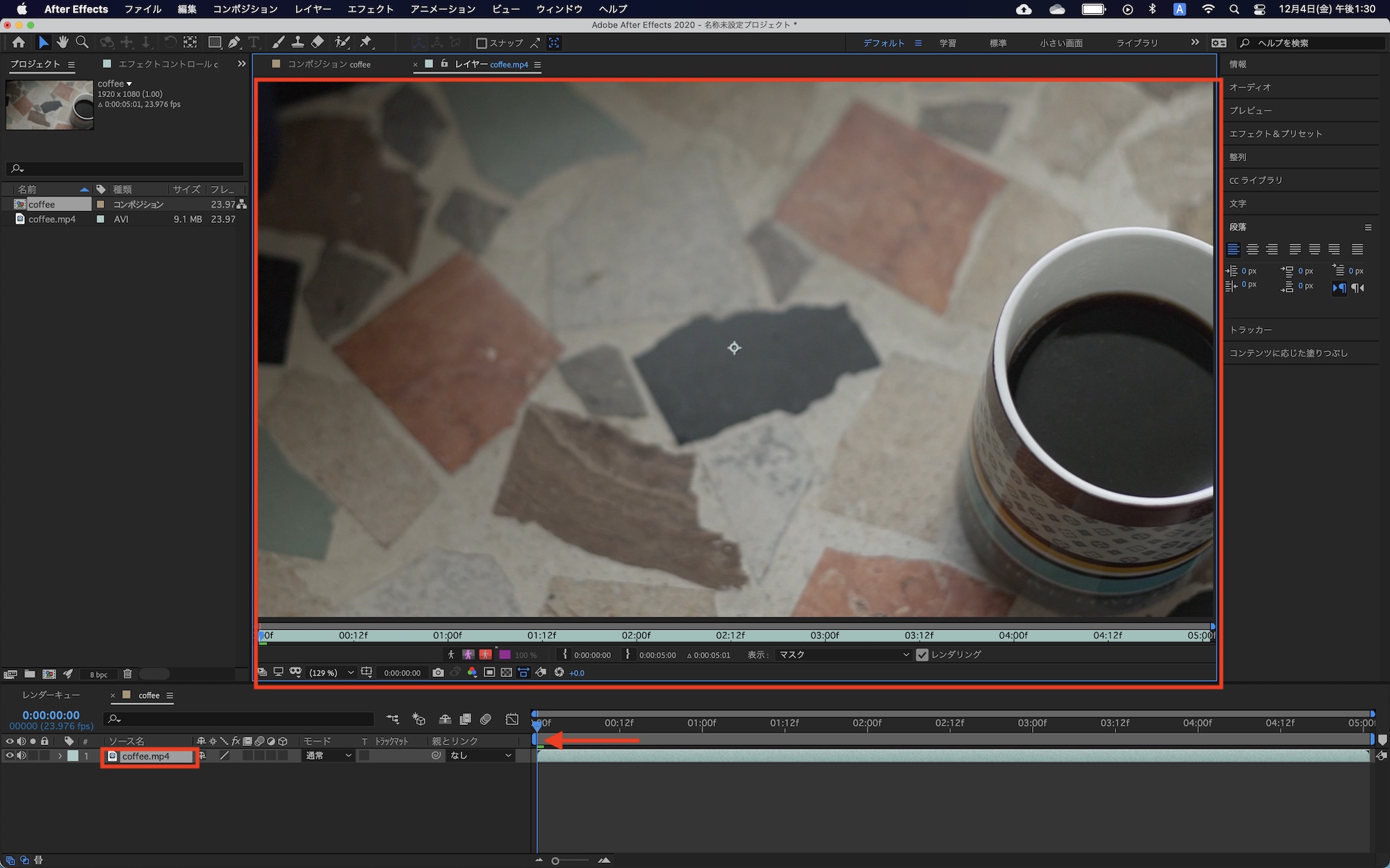 ファイルを追加した後はクリップのフレームレートなどに合わせたコンポジションを新規作成し、クリップをタイムラインに追加します。筆者の素材では「1920x1080/23.976fps」にしています。