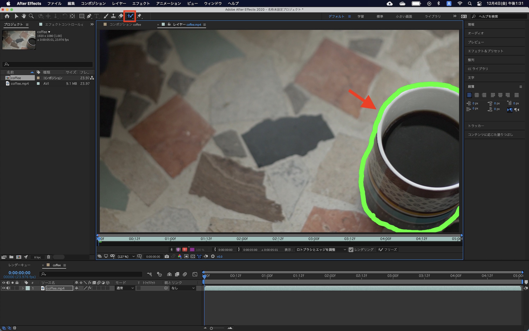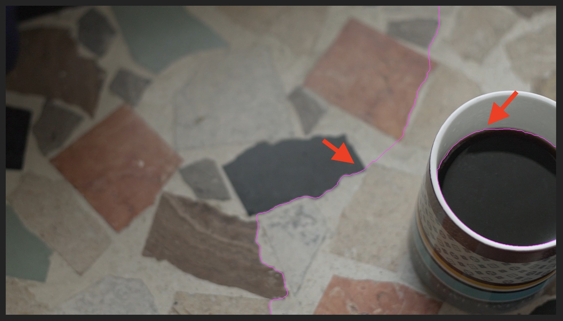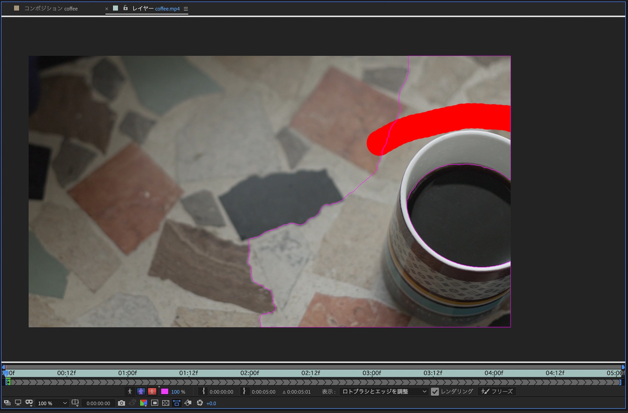 上部ツールバーからロトブラシを選択して、分離させたい被写体の輪郭(エッジ)をトレースしていきます。筆者の場合はテーブルとコーヒーカップを分けたいので、カップの形に沿ってなぞっていきます。