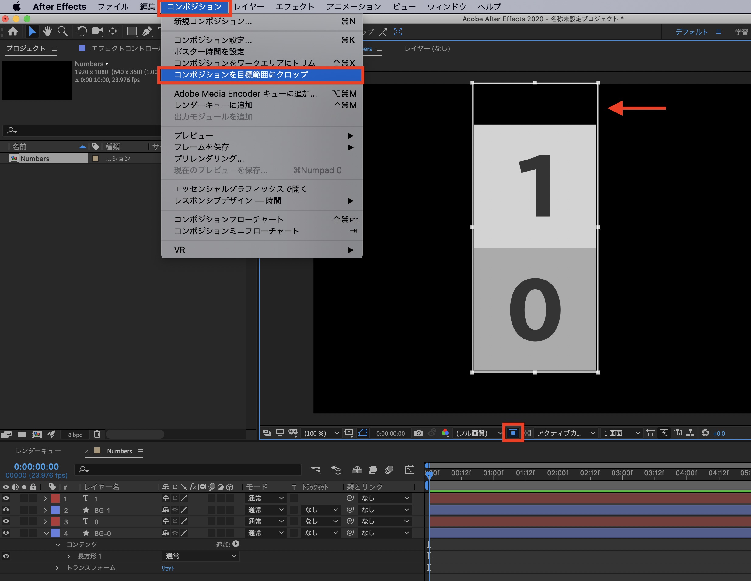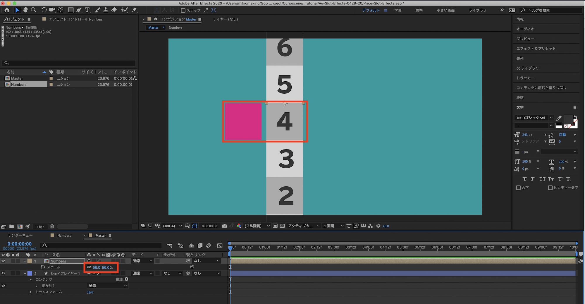 その後は作成した番号(Numbers)のコンポジションをタイムラインに追加し、正方形と同じサイズになるようにスケールで調整します。