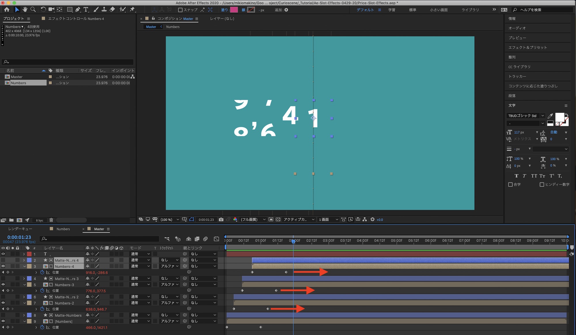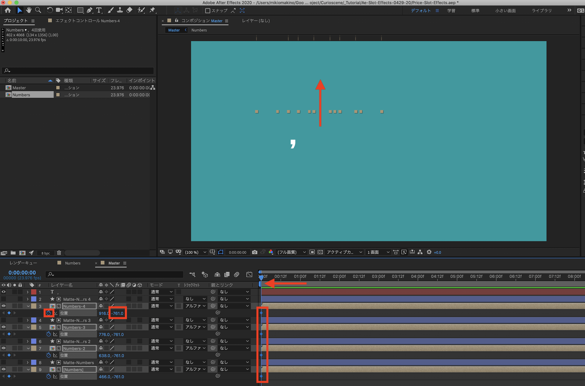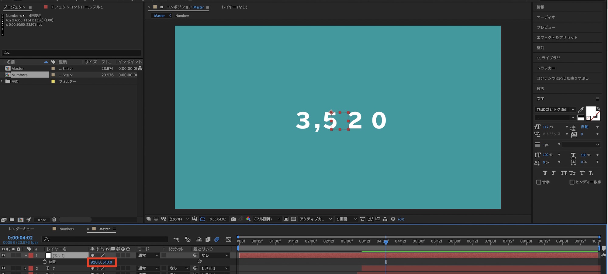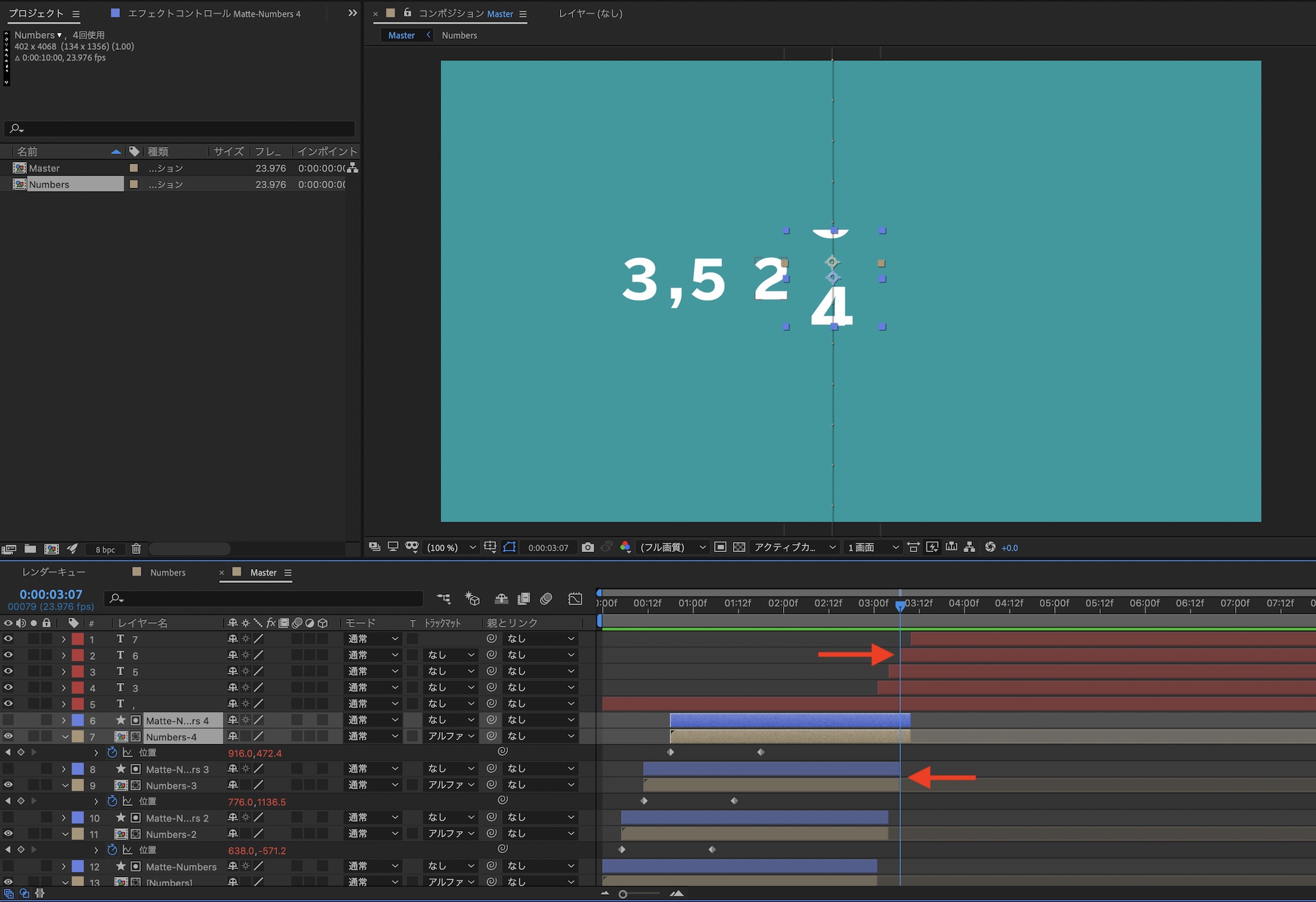 メインの「Master」コンポジションに戻って数字同士の間隔の調整を行います。「位置」を操作する際に「Numbers-」と「Matte-Numbers」のレイヤーを選択して動かすようにしましょう。
