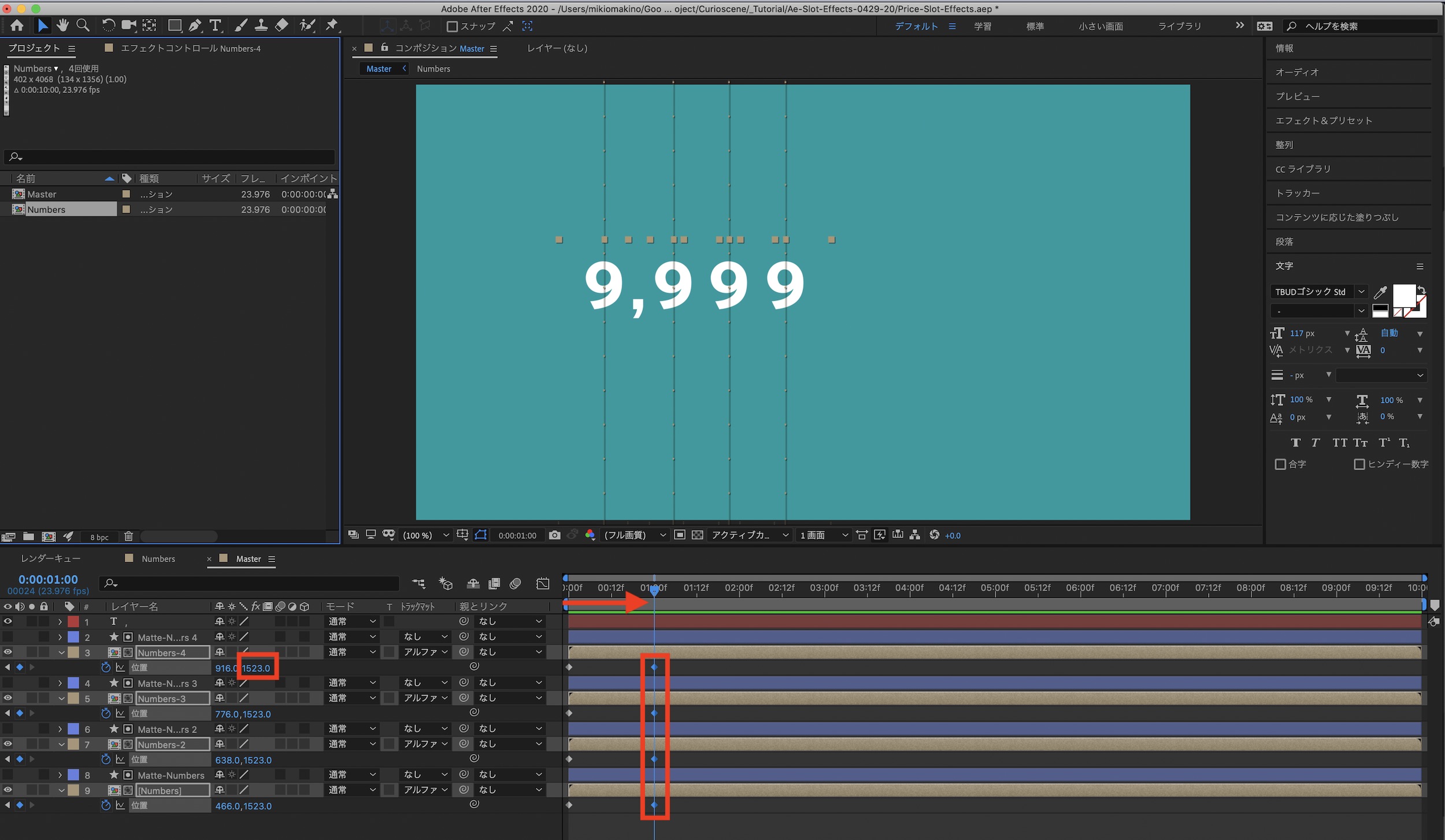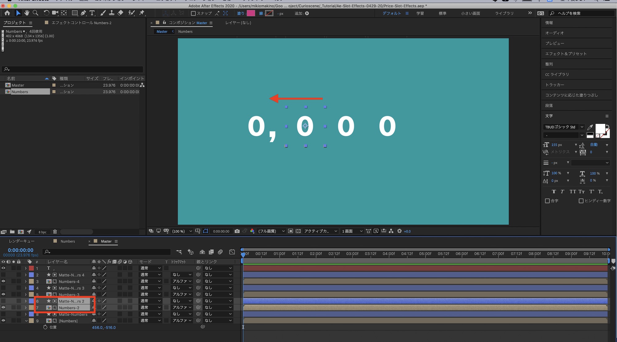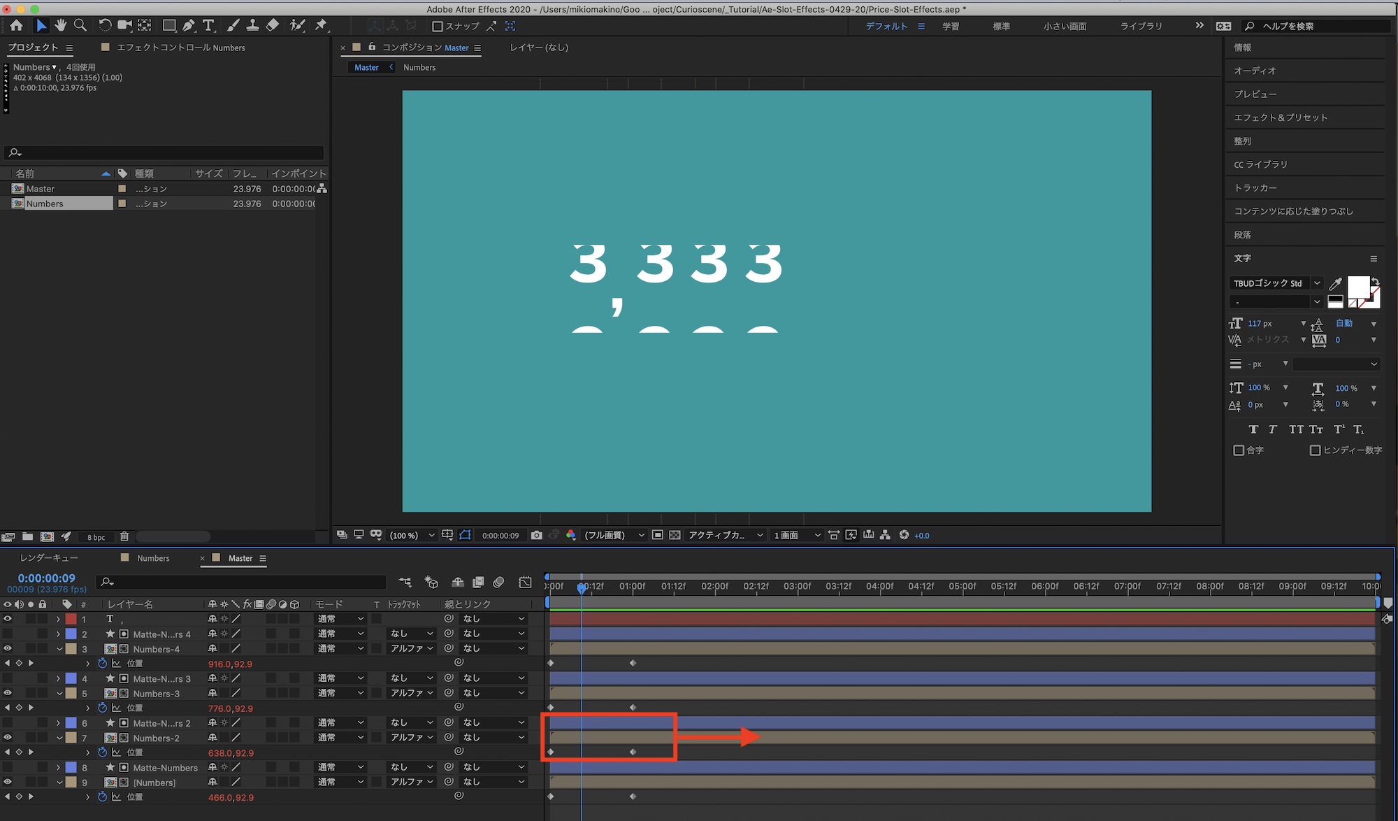 メインの「Master」コンポジションに戻って数字同士の間隔の調整を行います。「位置」を操作する際に「Numbers-」と「Matte-Numbers」のレイヤーを選択して動かすようにしましょう。