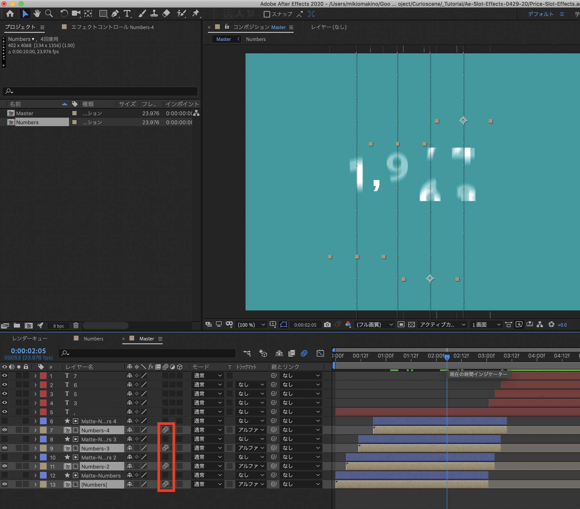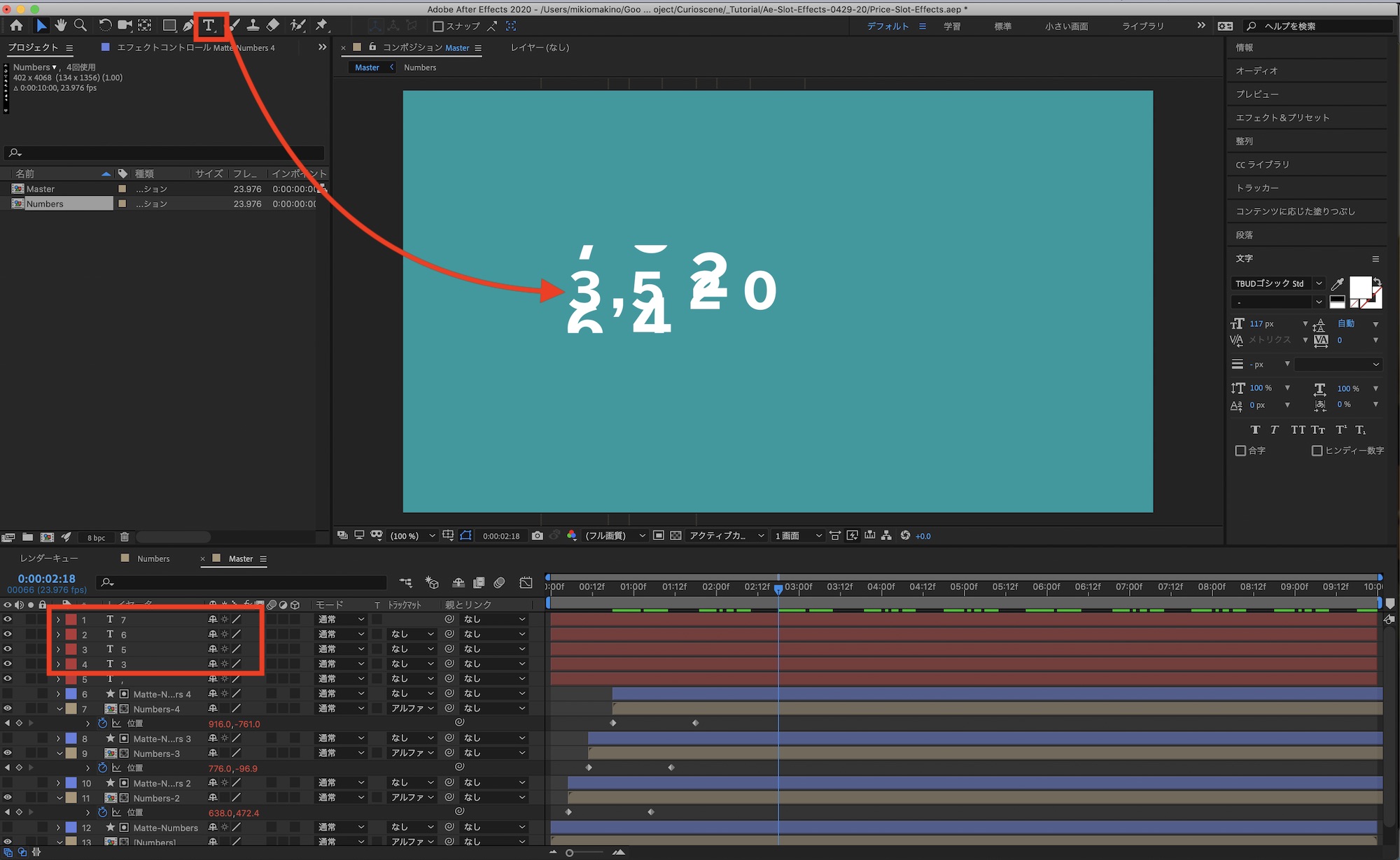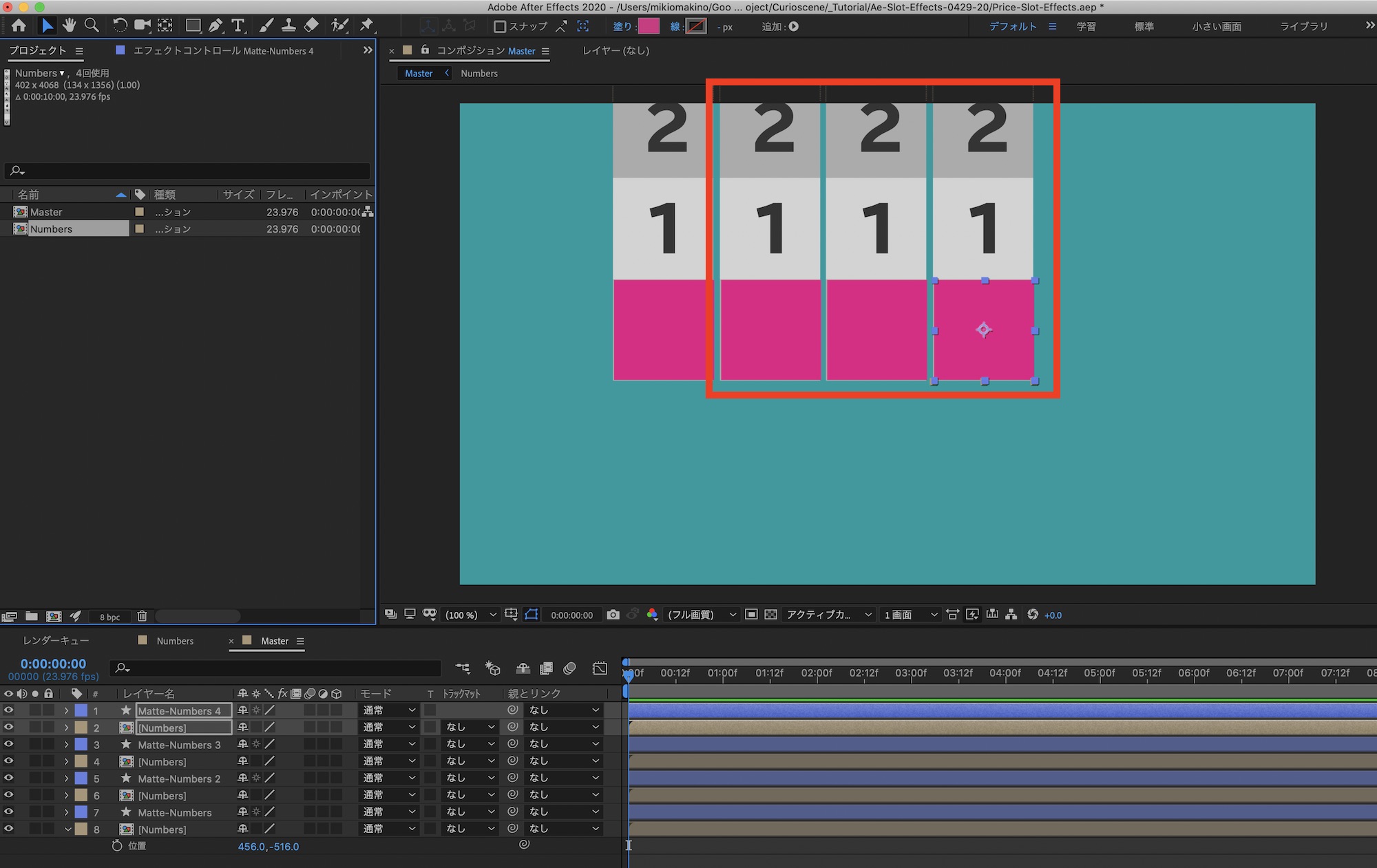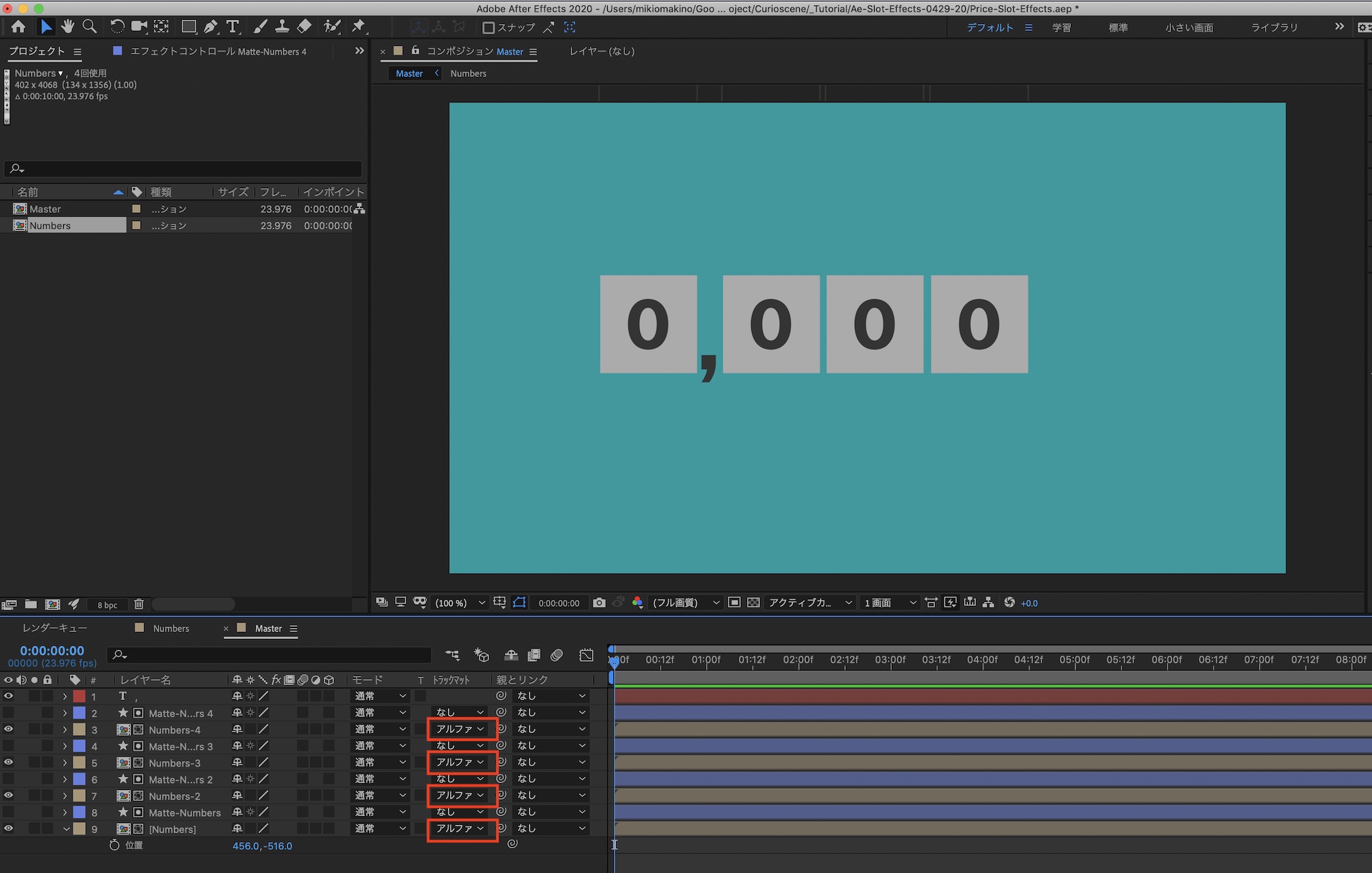 メインの「Master」コンポジションに戻って数字同士の間隔の調整を行います。「位置」を操作する際に「Numbers-」と「Matte-Numbers」のレイヤーを選択して動かすようにしましょう。