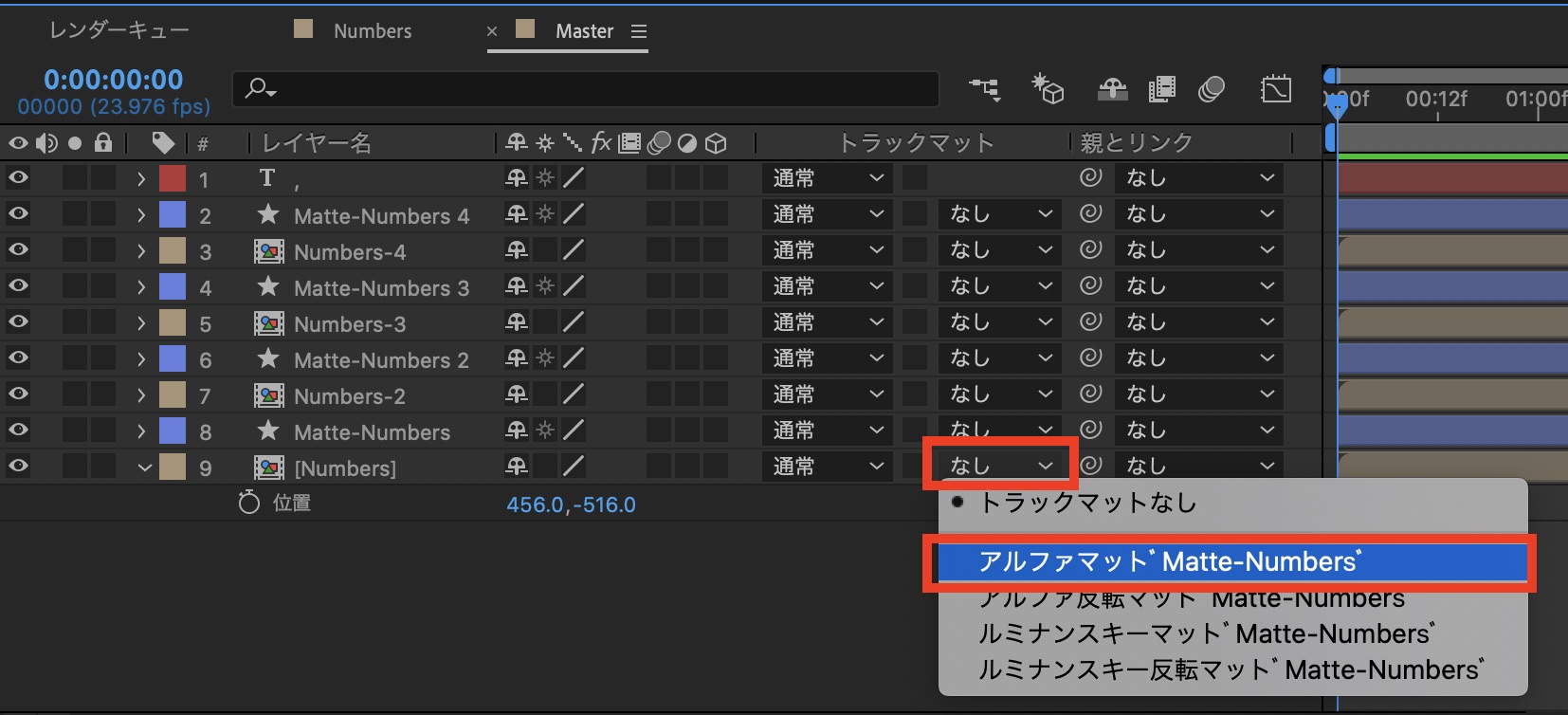 「Numbers」のレイヤーを選択して「トラックマット」から「アルファマット”Matte-Numbers”」を選択します。他の「Numbers-」レイヤーにもトラックマットを適用させましょう。