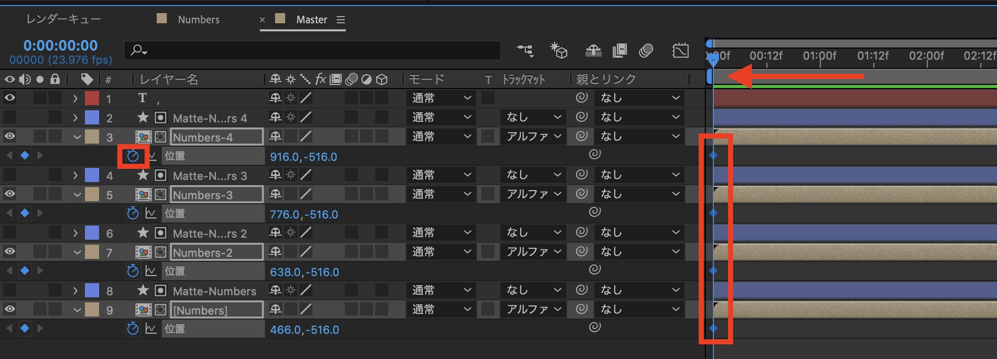 現段階では数字が同じタイミングで表示されてしまうため、左から順番に現れるように「Numbers-」と「Matte-Numbers-」のレイヤーを少しずつずらしましょう。