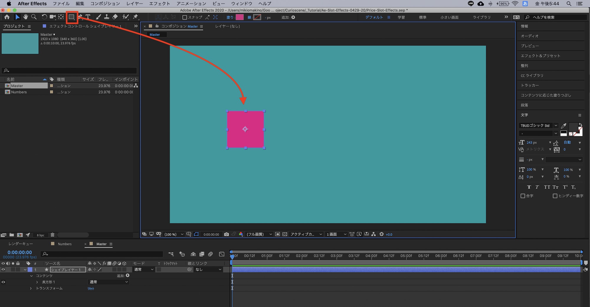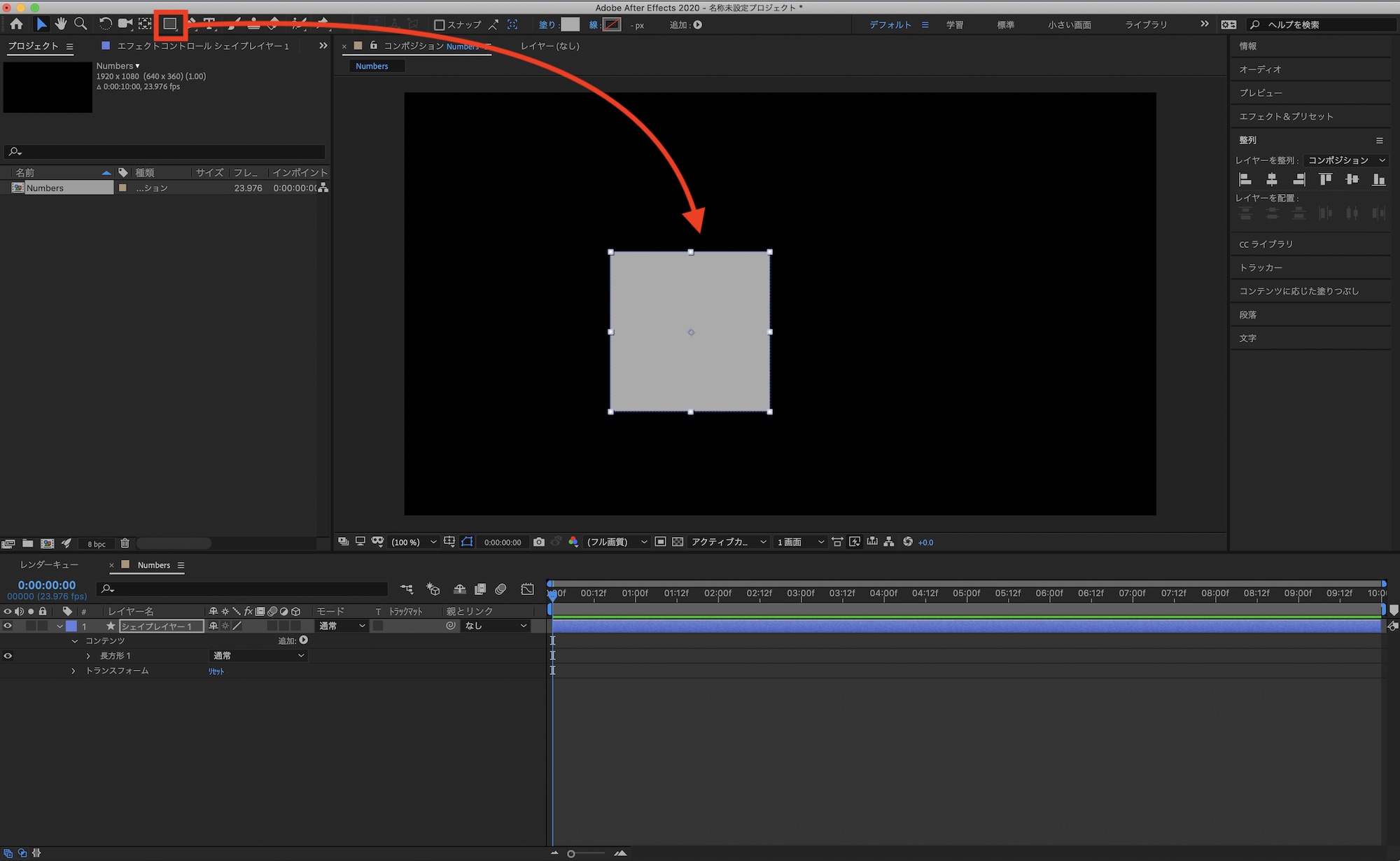 コンポジションを追加したら、シェイプツールを使って正方形を追加していきます。大きさの指定は特にありませんが、500px以上であれば問題ないと思います。