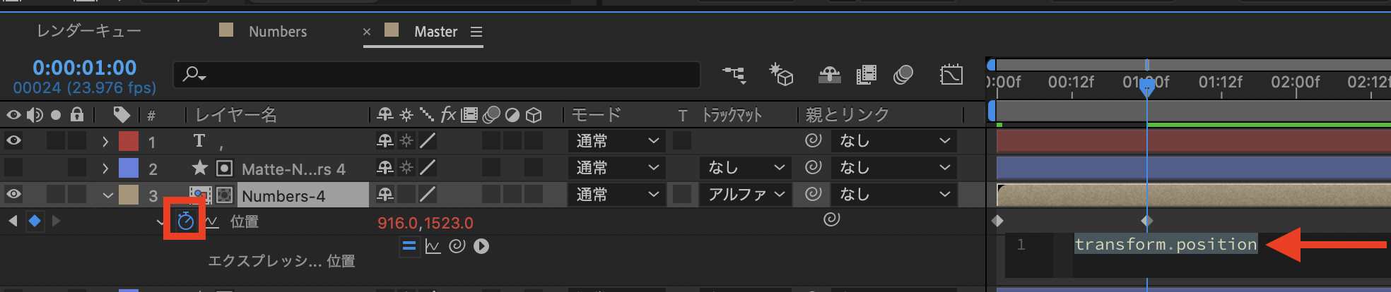「Numbers-」レイヤーの「位置」にあるストップウォッチアイコンを「Alt(Option)キー」を押しながらクリックして、エクスプレッションの入力画面を開きます。