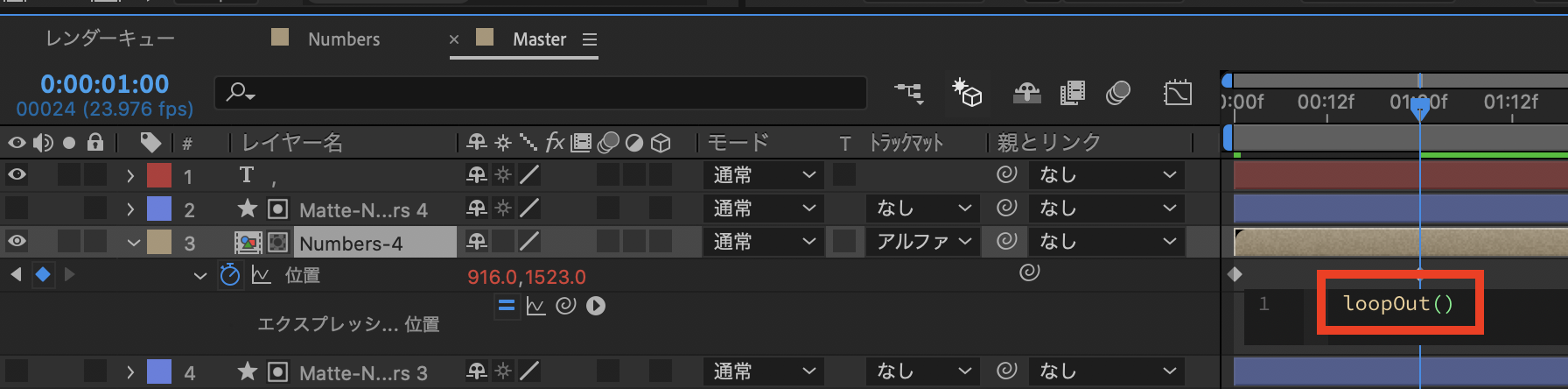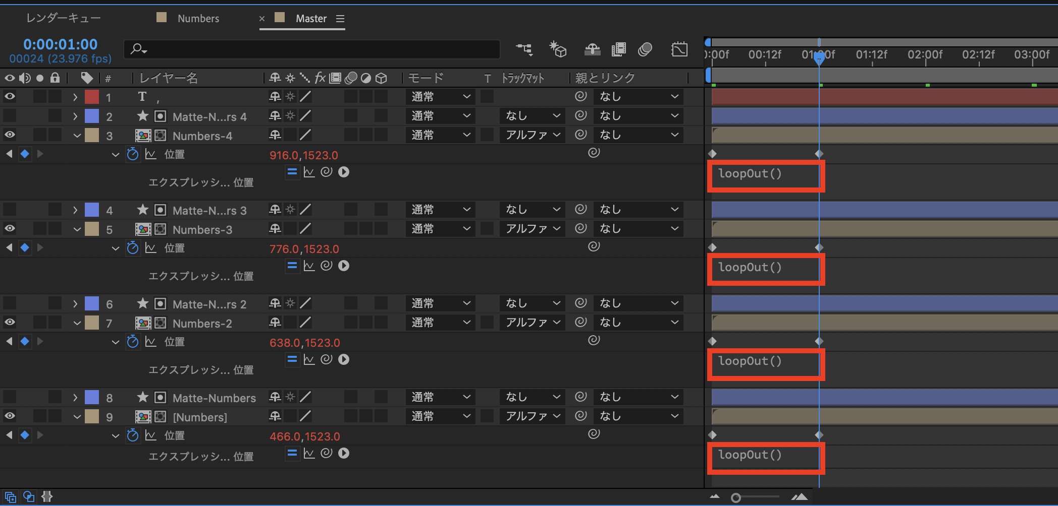 そこに「loopOut()」と入力し、他の「Numbers-」レイヤーにも同じように適用させます。ちなみにこのエクスプレッションは動作をループさせるものになっています。
