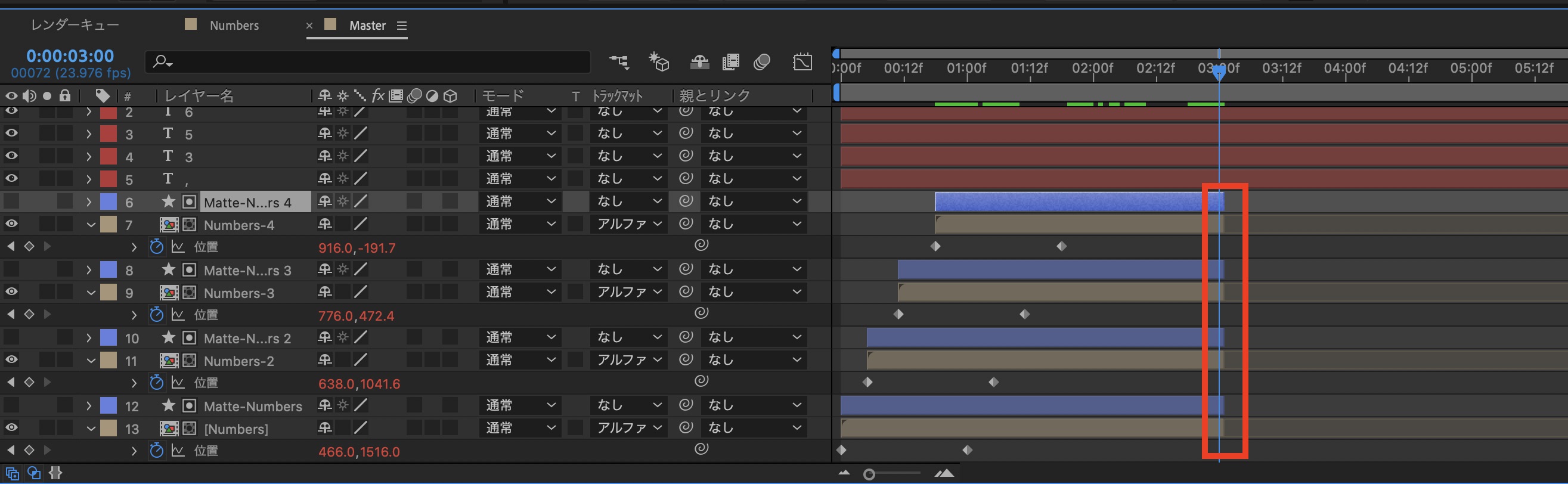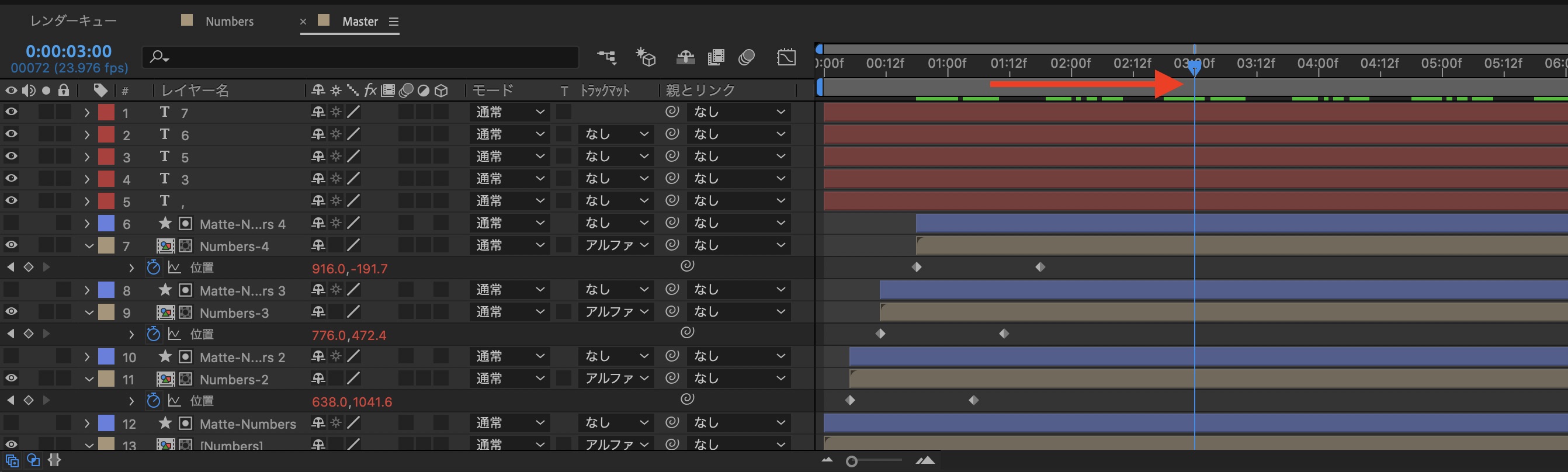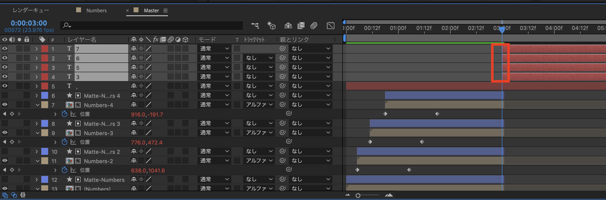 タイムインジケーターを「3秒」に動かし、「Numbers-」と「Matte-Numbers-」レイヤーをトリム(Alt(Option)キー + 」 )します。