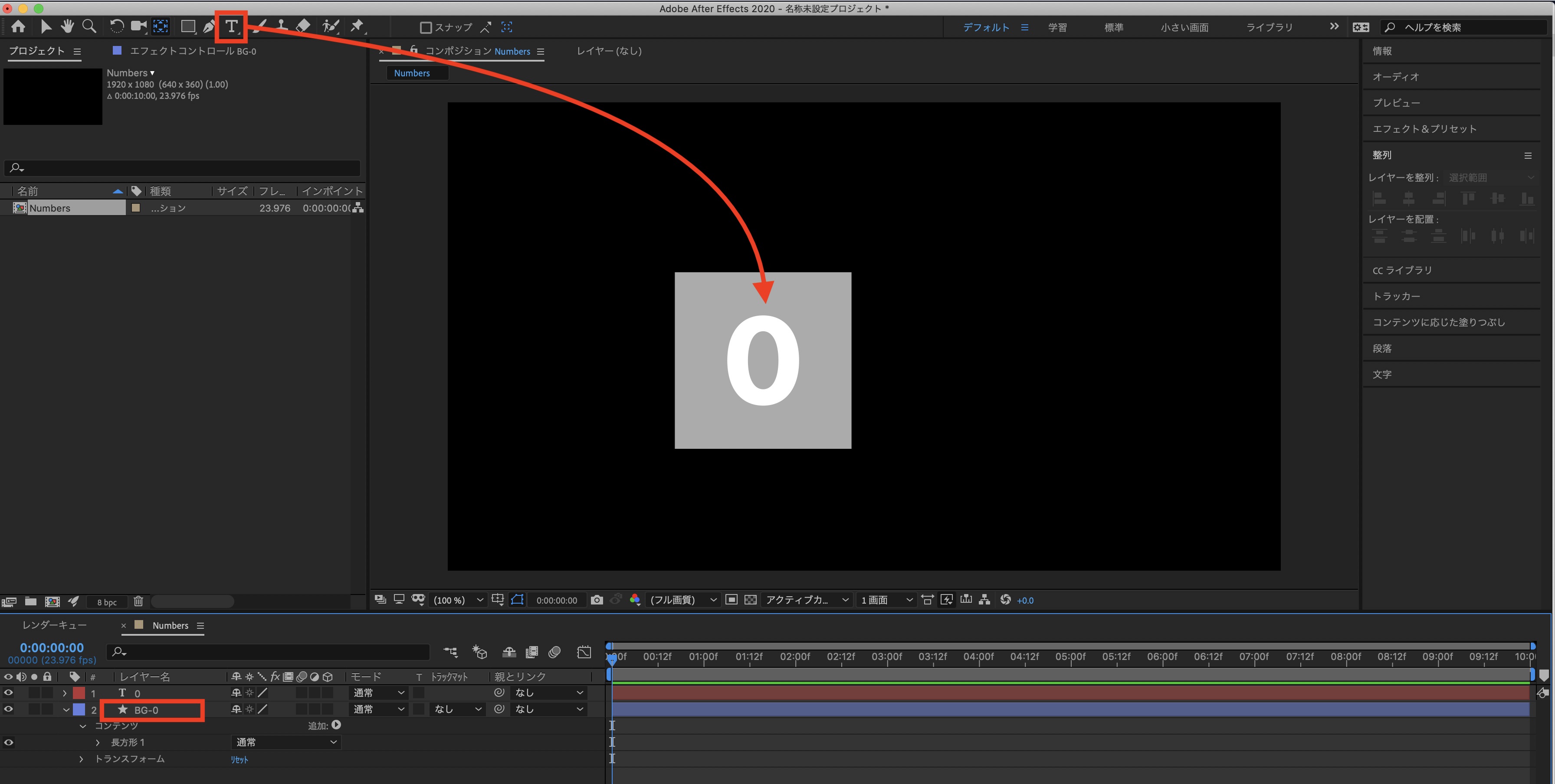 タイムインジケーターを「0秒」に移動させ、「Numbers-」の数字が上から現れるように配置します。