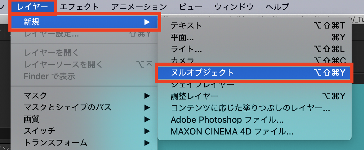 ちなみに全てのアニメーションの位置を動かしたい場合は上部メニューの「レイヤー」、「新規」から「ヌルオブジェクト」を追加します。