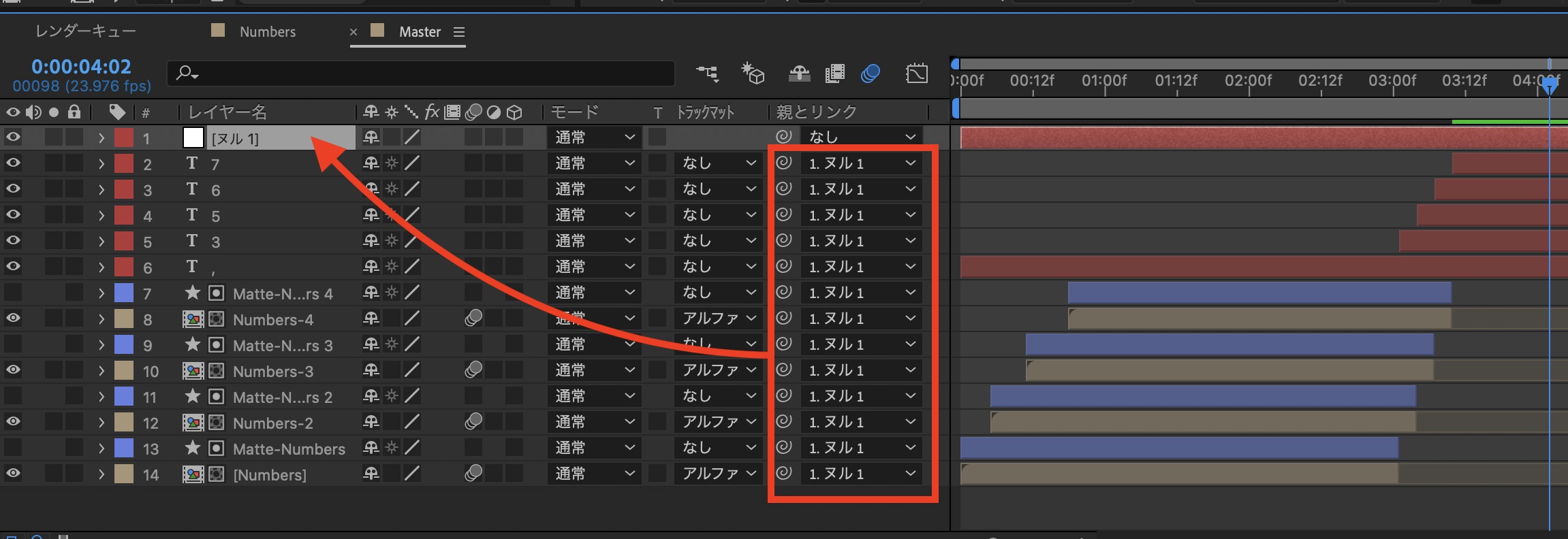 ヌルを数字の中央に配置し、ヌルを除く全てのレイヤーを選択して「親とリンク」またはピックウィップから「ヌル1」を選びます。