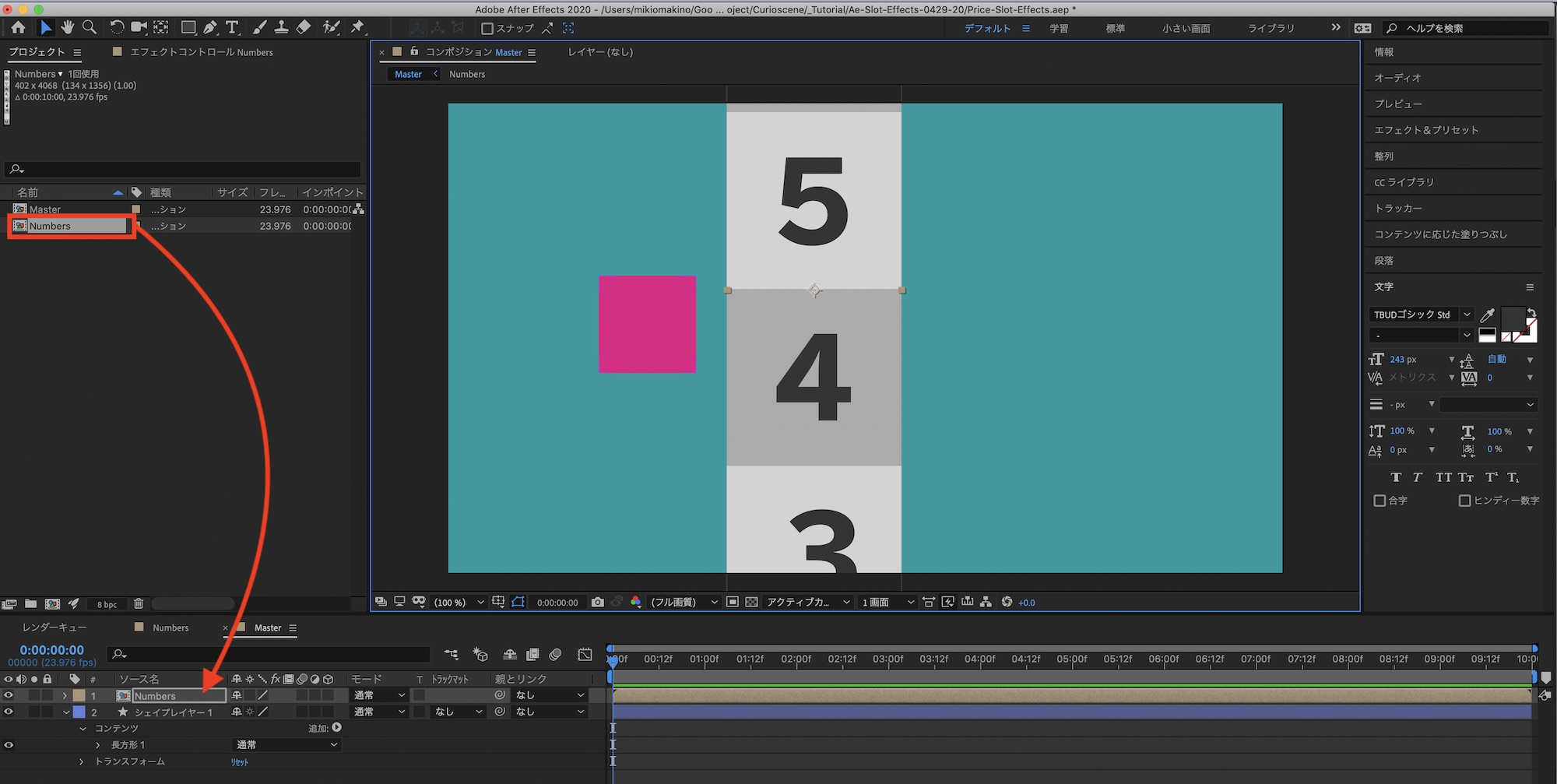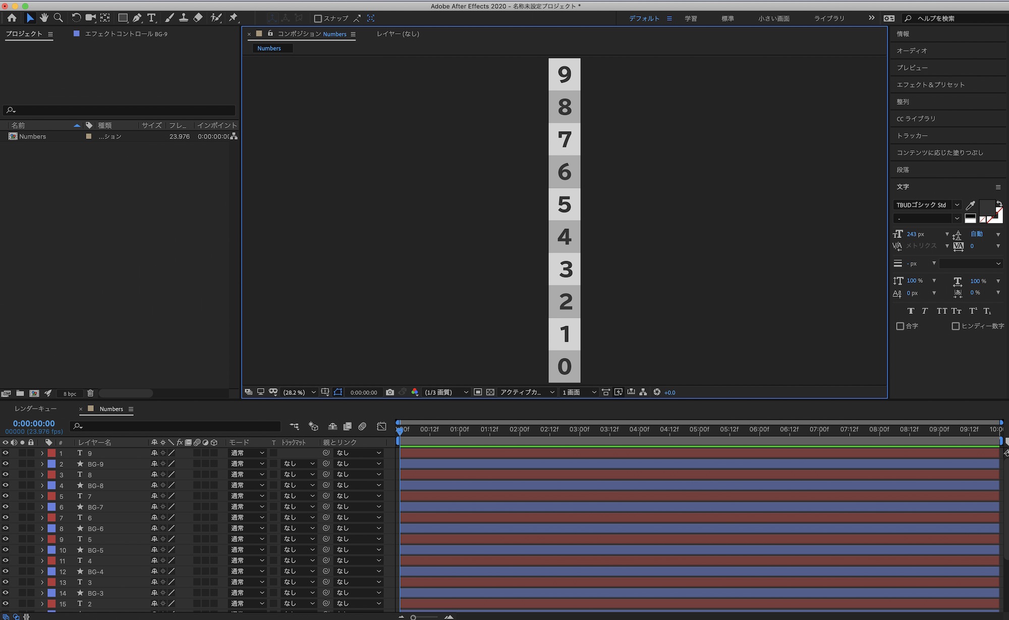 「Numbers」のコンポジションに戻って、シェイプの非表示と文字色の変更を行いました。