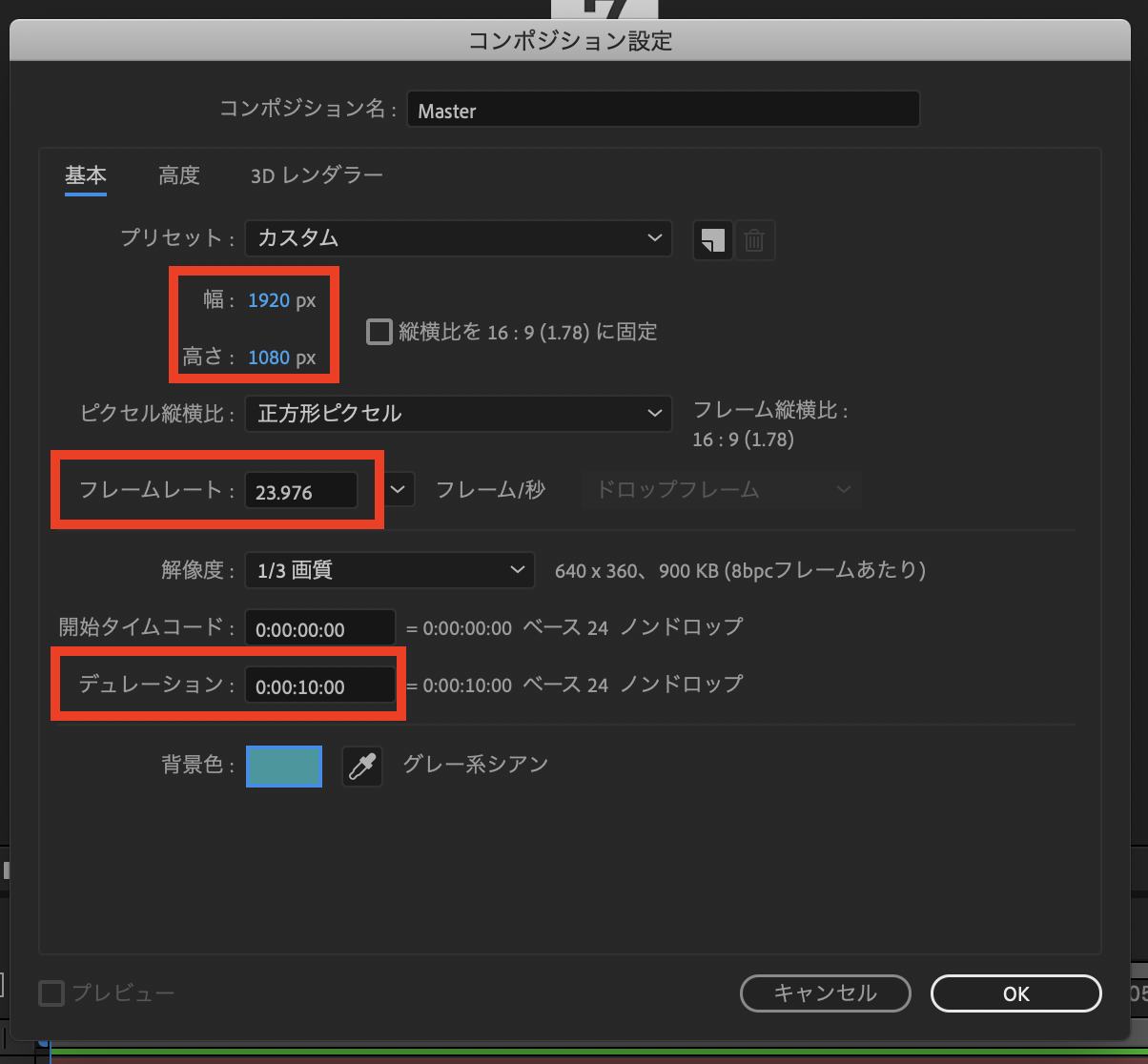 After Effectsを開いたらコンポジションを新しく作成しましょう。ひとまず設定は「1920x1080」、「23.976fps」で、デュレーションを「10秒」にしています。