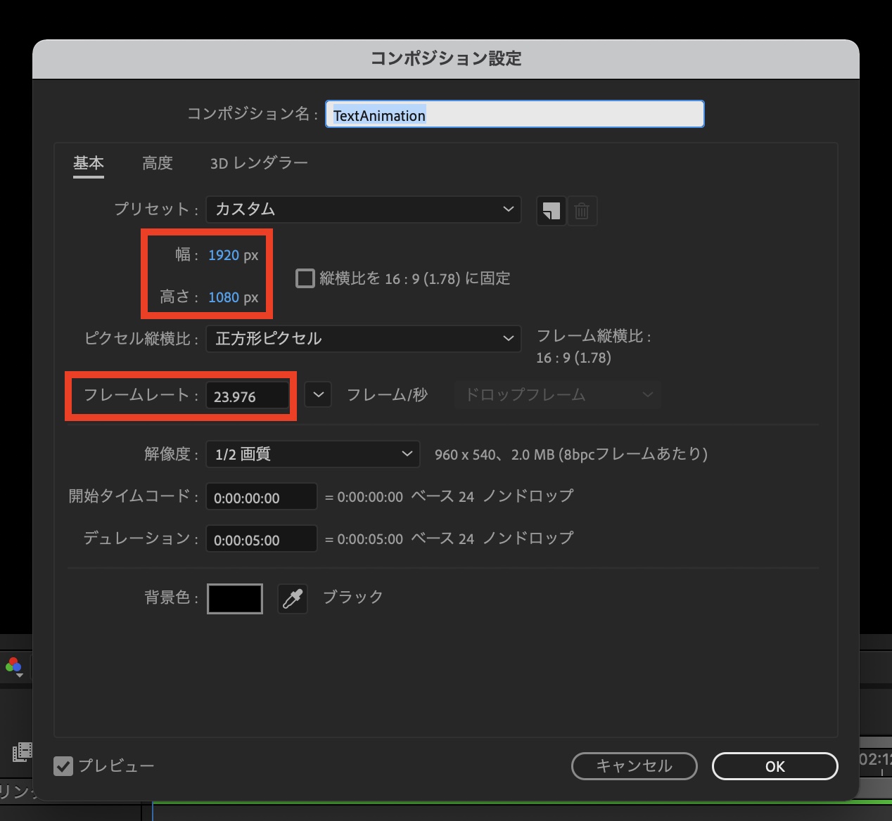 After Effectsを開きコンポジションを作成します。筆者の場合は「1920x1080/23.976fps」、デュレーションを「5秒」にしていますが、プロジェクトに合わせて変更すると良いでしょう。
