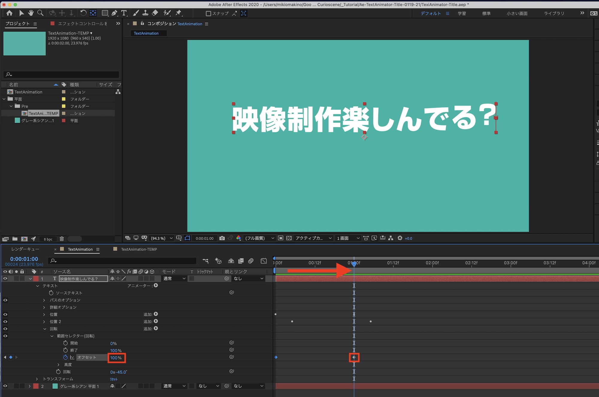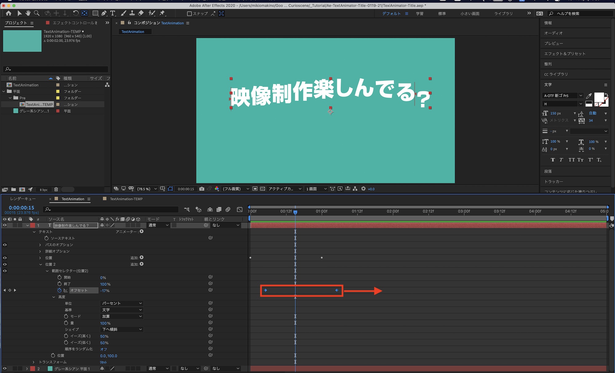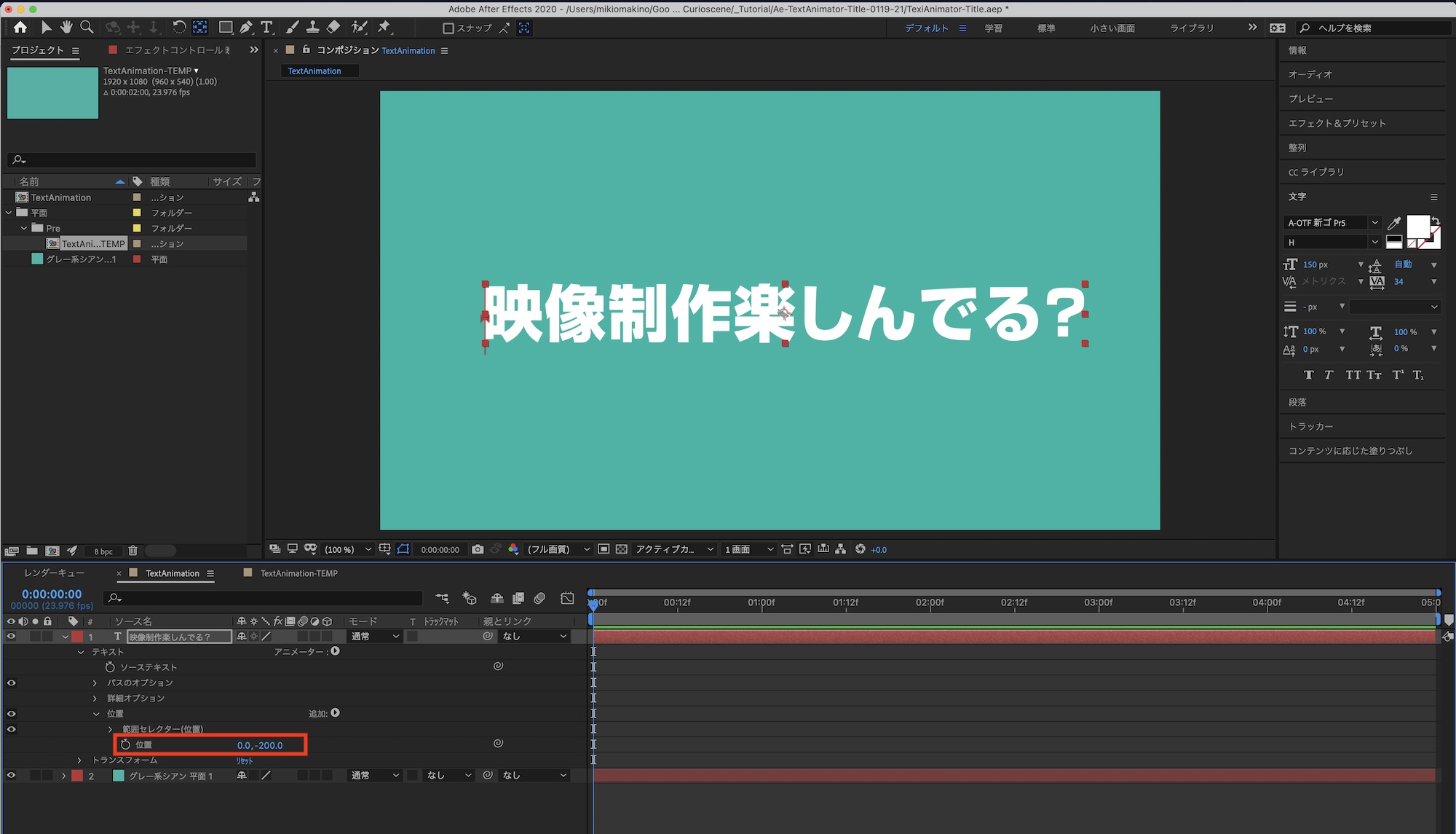 「映像制作楽しんでる?」という文字列を動かす場合、各文字をそれぞれのレイヤーに分けて、トランスフォームを使ってアニメーションを加えることも可能ですが、その方法だと文章の修正やアニメーションの調整が非常に面倒になってしまいます。