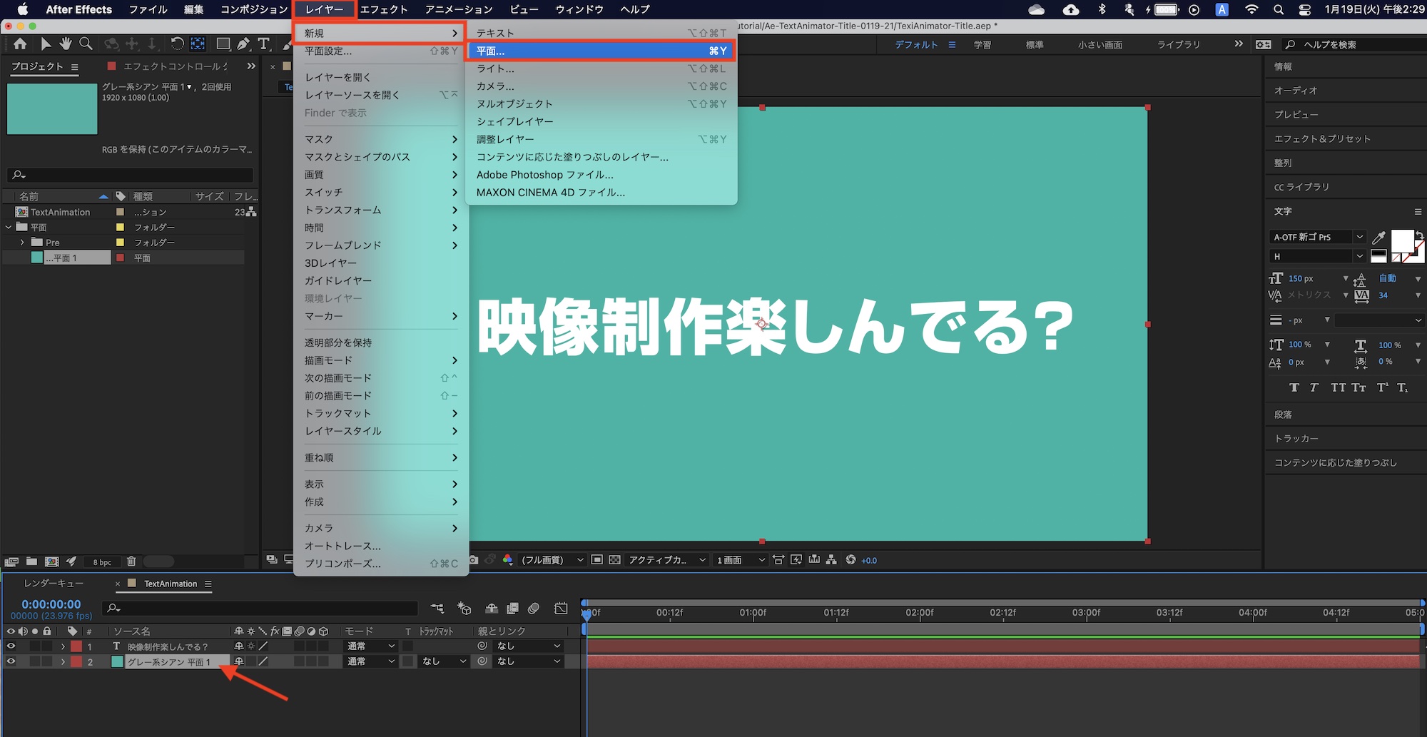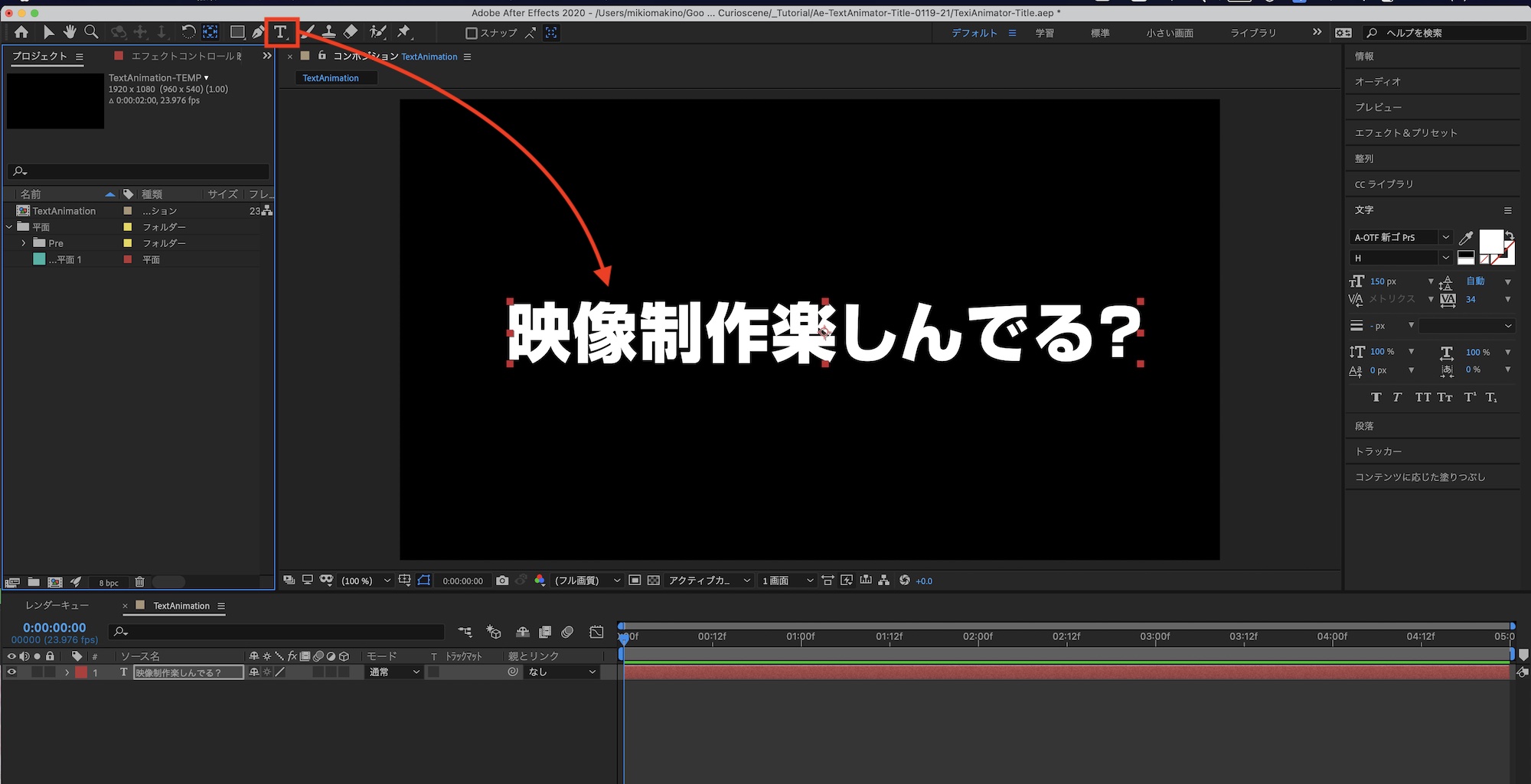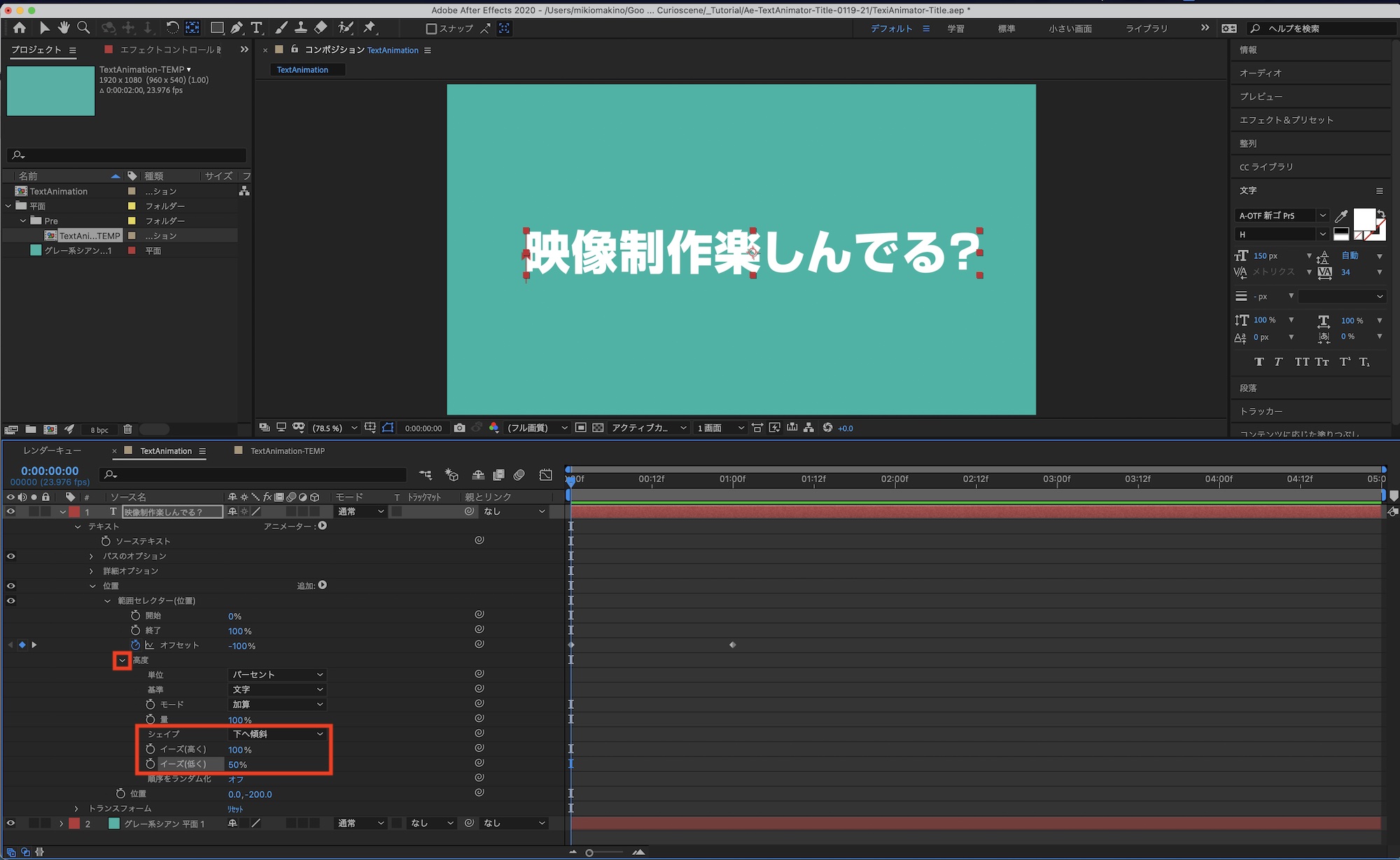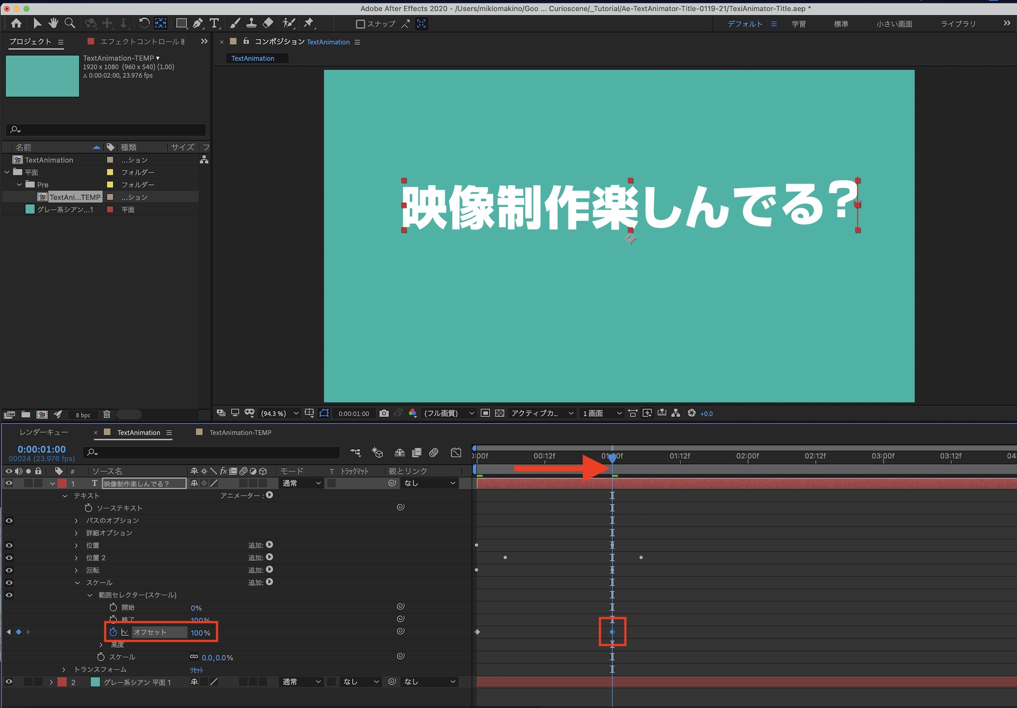 「映像制作楽しんでる?」という文字列を動かす場合、各文字をそれぞれのレイヤーに分けて、トランスフォームを使ってアニメーションを加えることも可能ですが、その方法だと文章の修正やアニメーションの調整が非常に面倒になってしまいます。