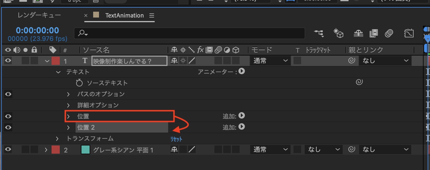 こちらのチュートリアルでは「位置」、「回転」、「スケール」の3つのパラメーターを使ってタイトルアニメーションを作成していきます。まず、一覧から「位置」を選択してレイヤーに追加しましょう。