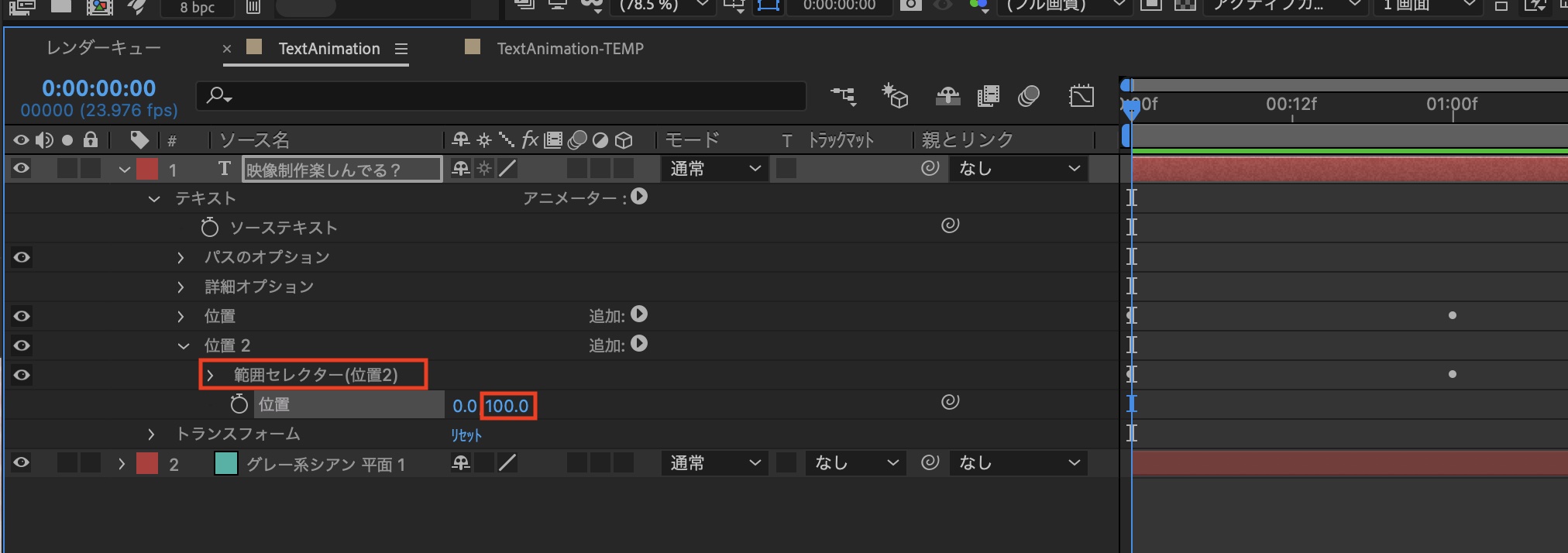 「範囲セレクター」を「範囲セレクター(位置2)」に名称変更し、「位置」の数値を「100」にします。