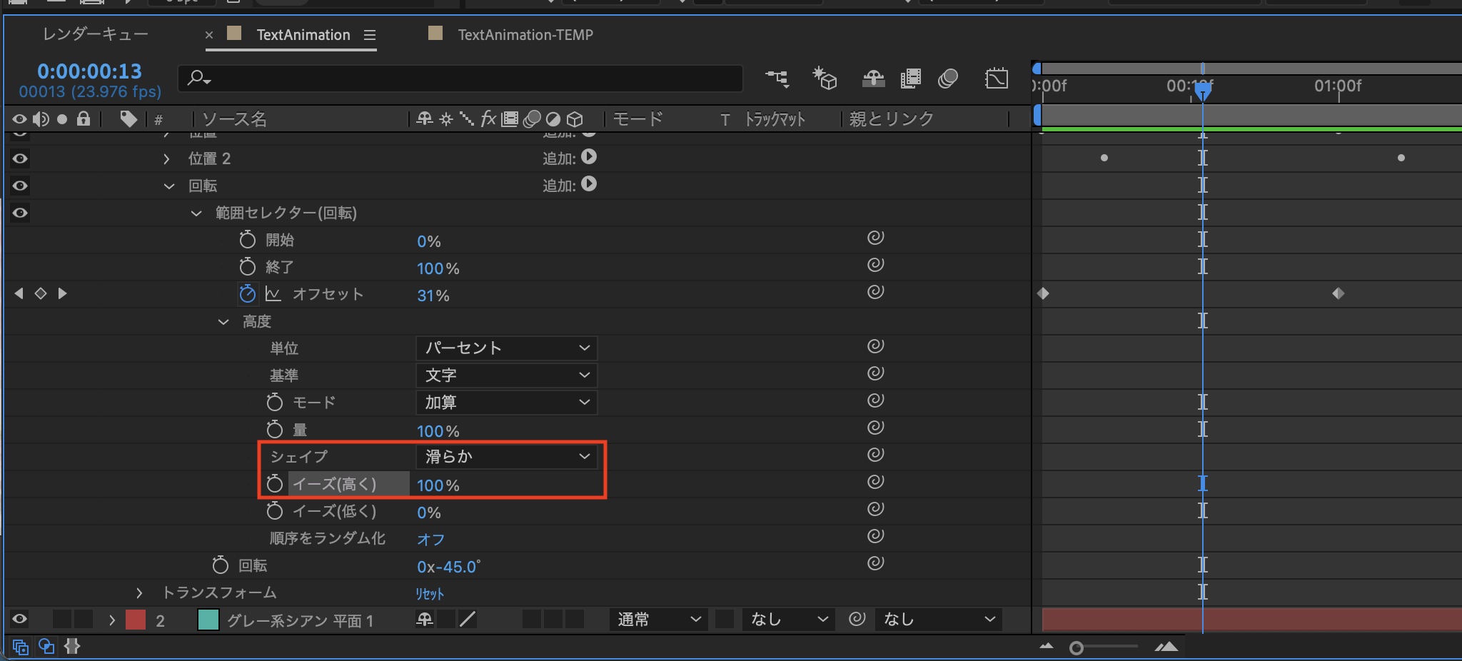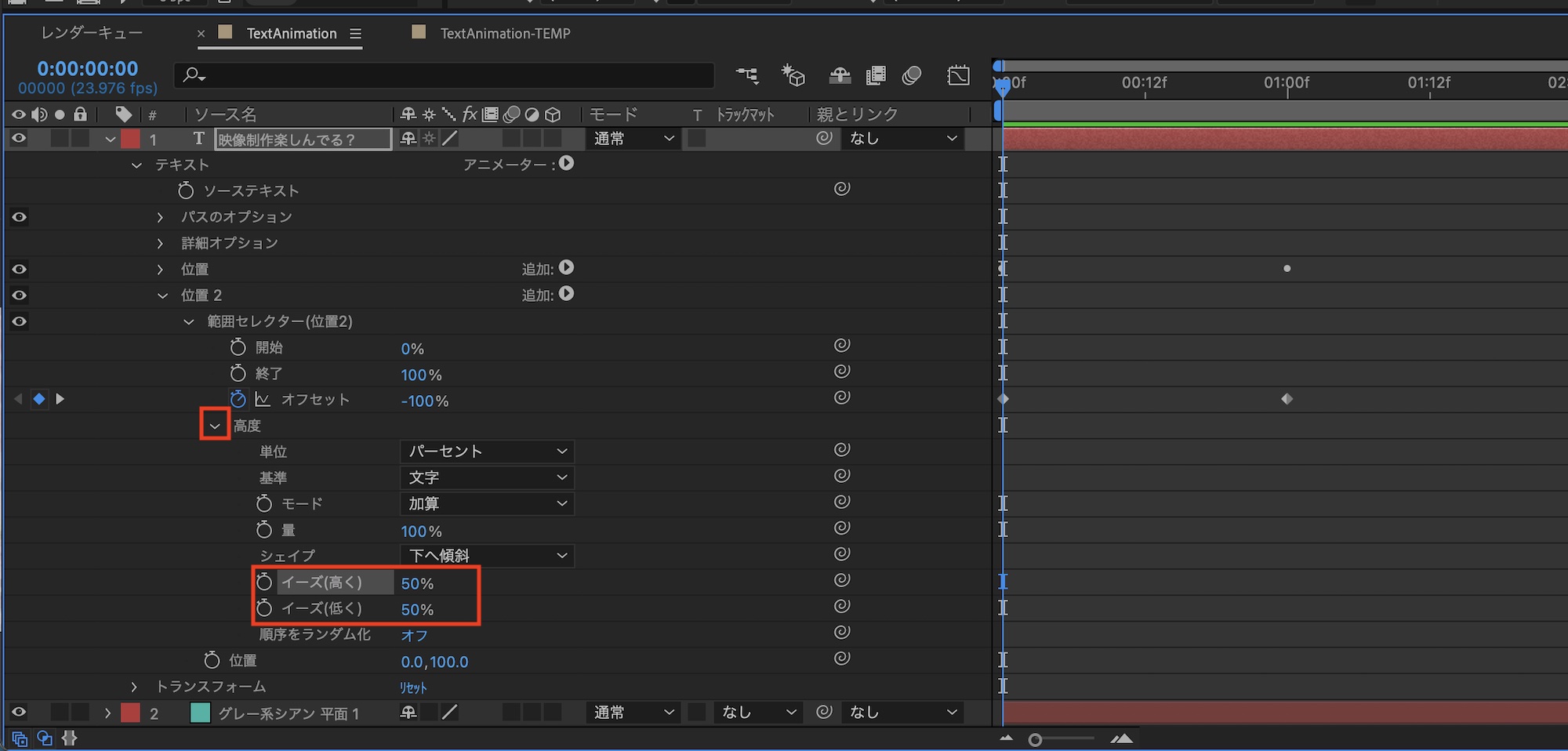 アニメーションにイージングを加えていきます。グラフエディタを使ってキーフレームにイージングを追加する方法と異なり、「範囲セレクター」の「高度」のオプションから操作を行います。