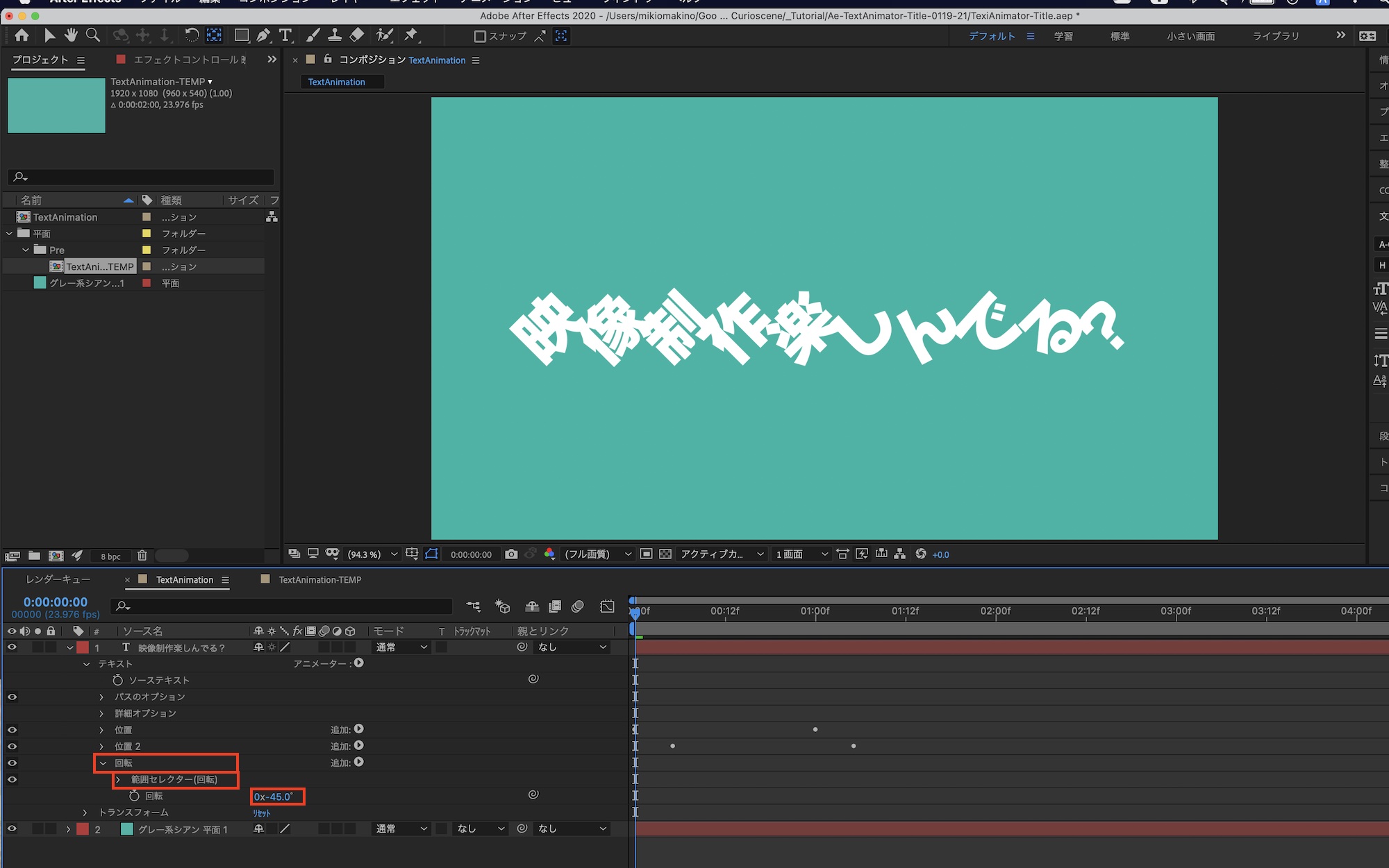 「アニメーター1」と「範囲セレクター」の名称をそれぞれ「回転」、「範囲セレクター(回転)」へと変更し、「回転」の数値を「-45°」にしましょう。