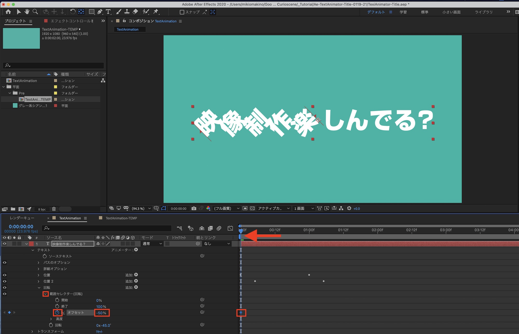 「範囲セレクター(回転)」の三角アイコンをクリックして展開し、タイムインジケーターを「0秒」に移した後で「オフセット」を「-50%」に変更後、ストップウォッチアイコンをクリックしてキーフレームを加えます。