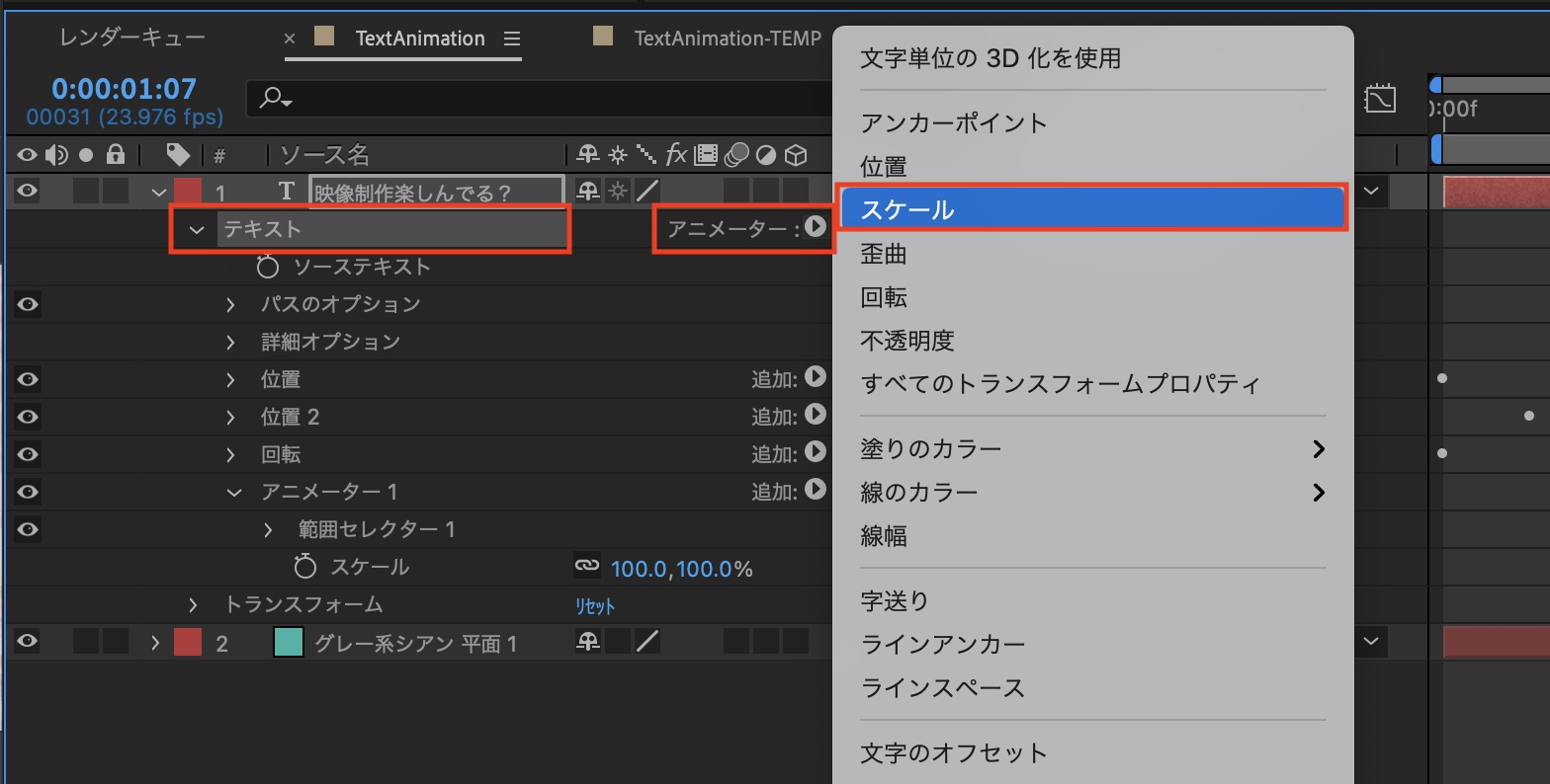 回転と同じ様に「テキスト」を選択した上で「アニメーター」から「スケール」をクリックします。