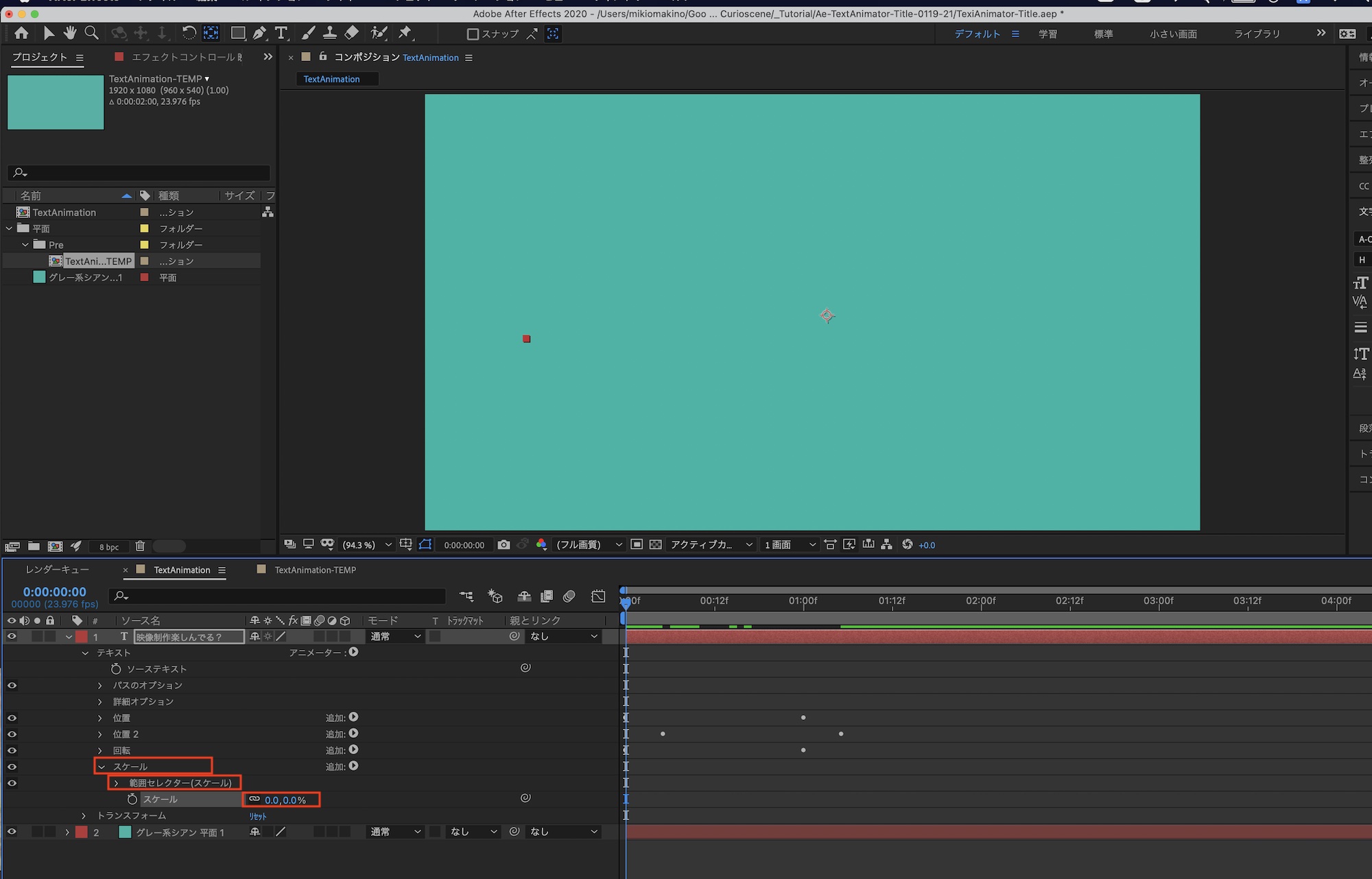 「アニメーター1」と「範囲セレクター」の名称をそれぞれ「スケール」、「範囲セレクター(スケール)」へと変更し、「スケール」の数値を「0%」にしましょう。
