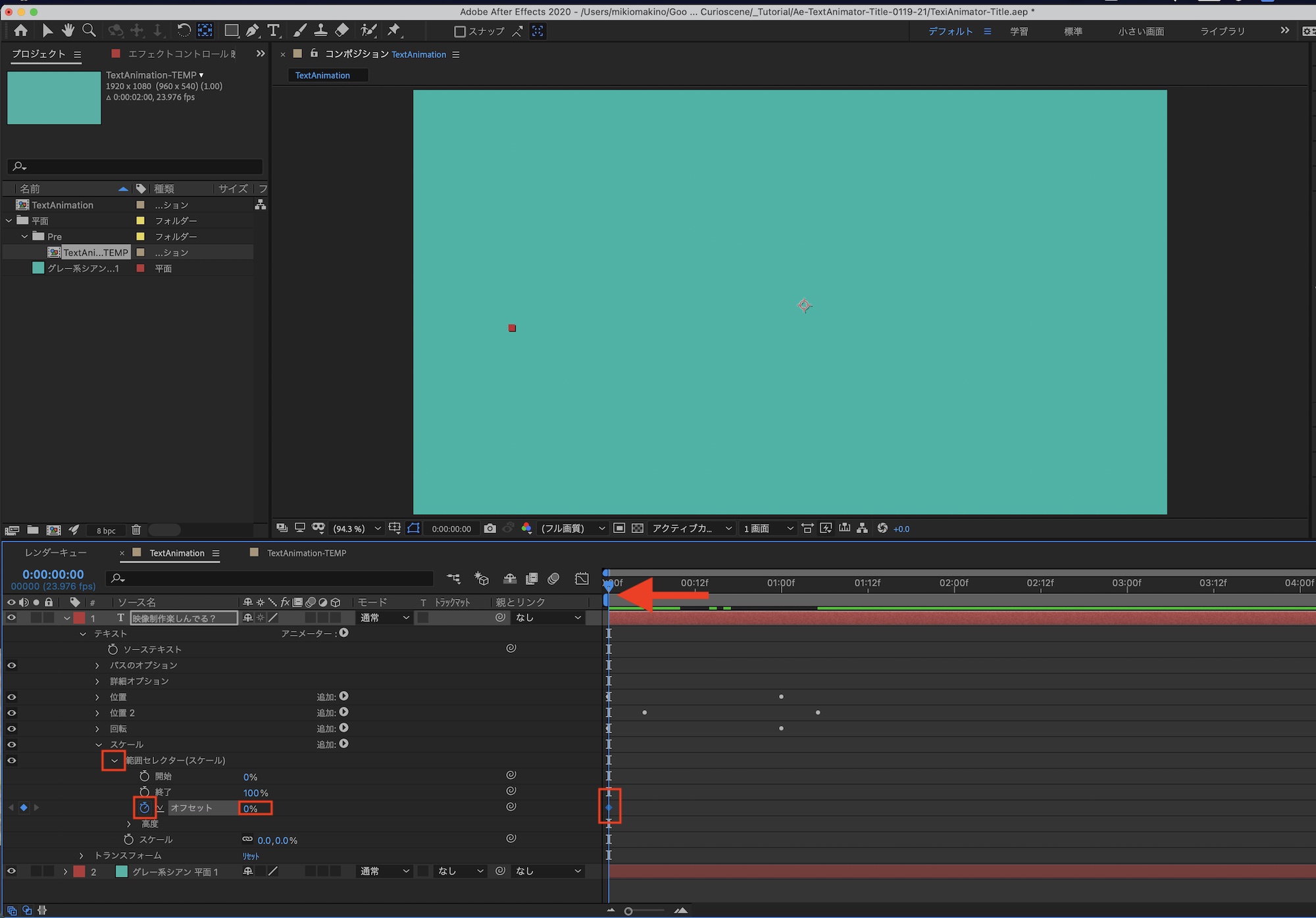 「範囲セレクター(スケール)」の三角アイコンクリックしてオプションを展開し、タイムインジケーターを「0秒」に動かし、「オフセット:0%」の状態をキーフレームとして追加します。
