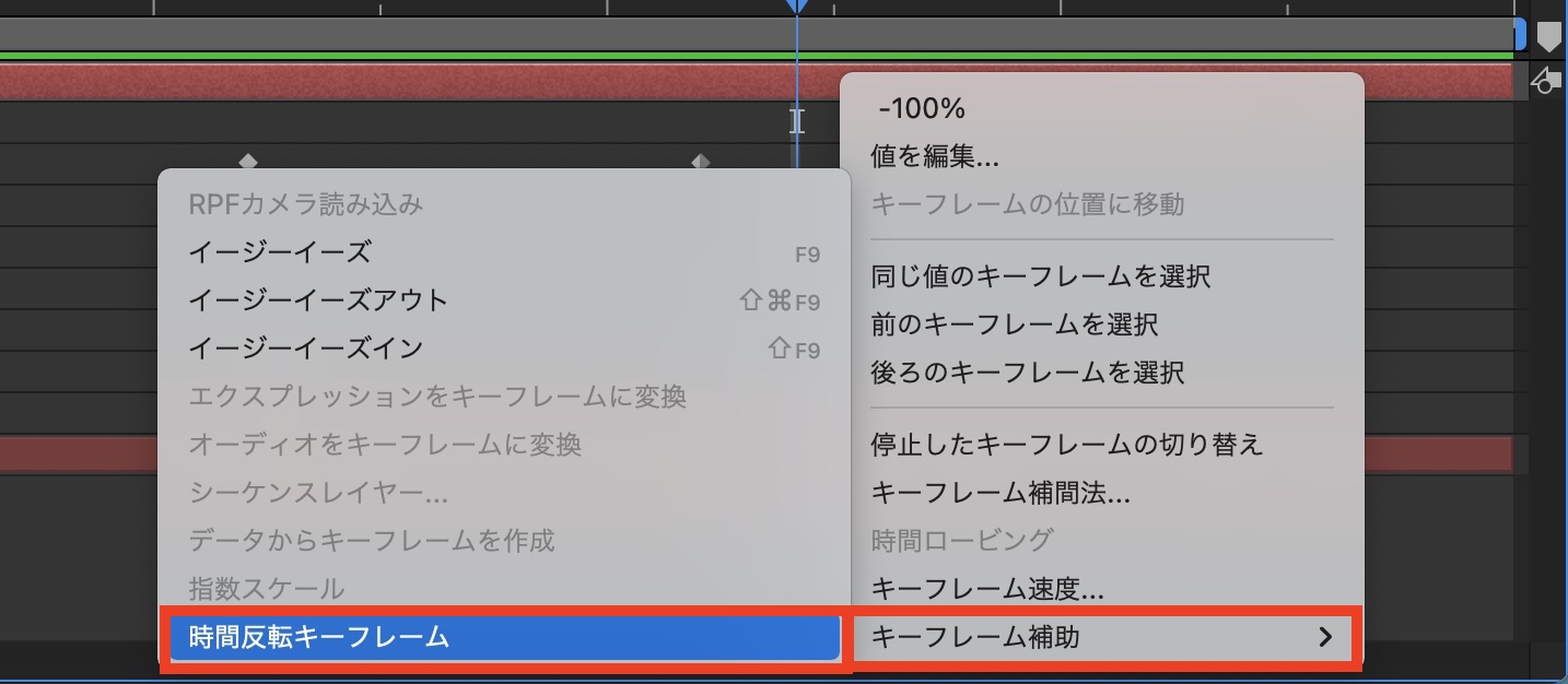 ちなみに、アニメーションを退場させたい場合はキーフレームをコピー&ペーストして「時間反転キーフレーム」を使用すると良いでしょう。