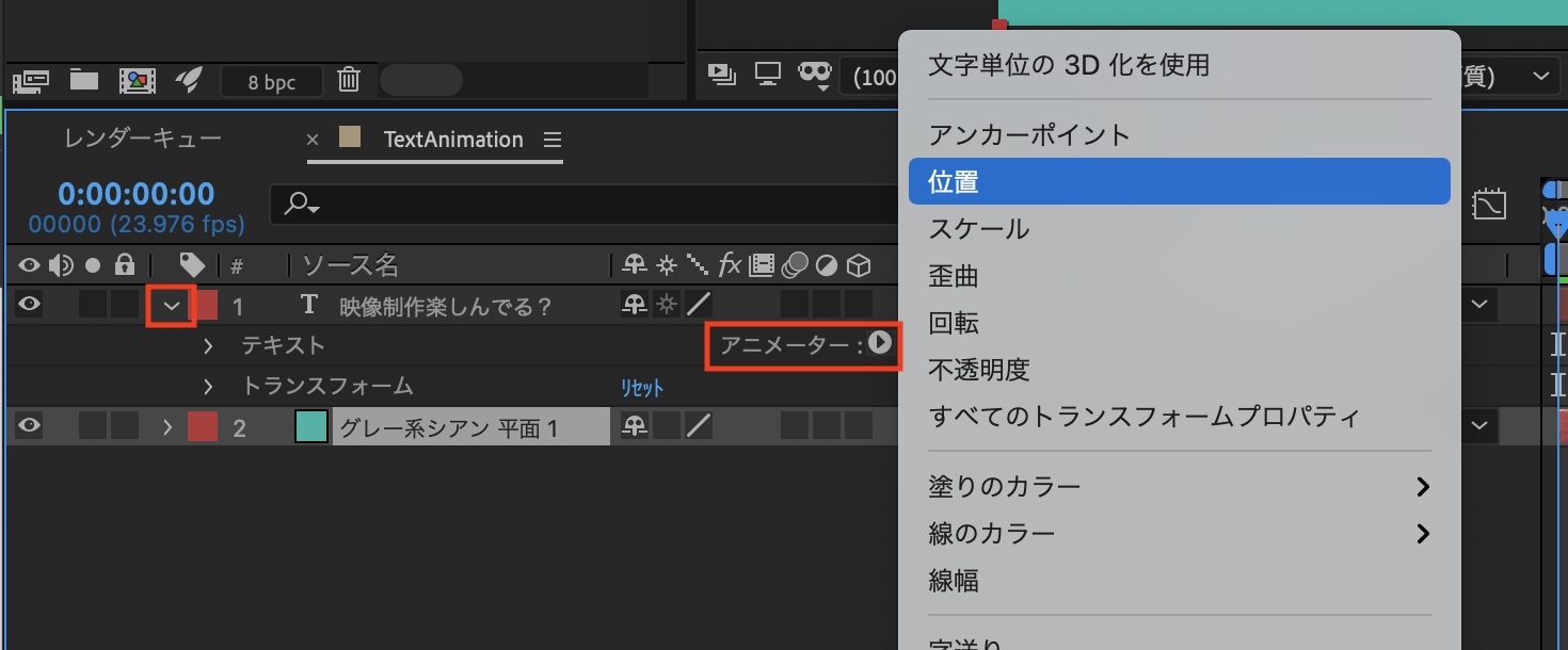 テキストレイヤーにアニメーターを追加していきます。三角アイコンをクリックしてオプションを展開し、右側の「アニメーター」からアニメーションに加えるパラメーターをクリックします。