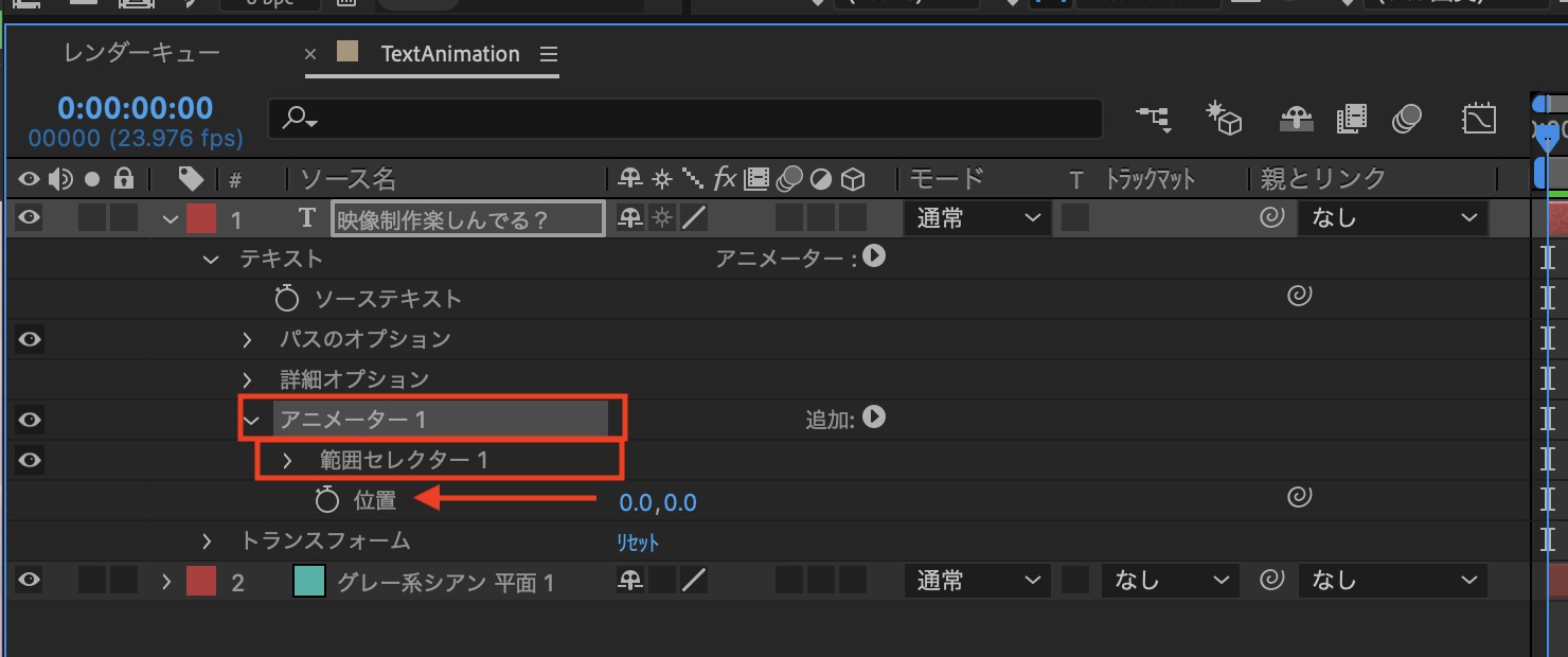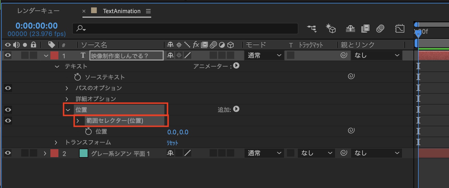 追加されたパラメーターは「アニメーター1」、「範囲セレクター1」の中に格納されています。後ほど他のアニメーターを追加していくので、わかりやすいように「アニメーター1」を「位置」に、「範囲セレクター1」を「範囲セレクター(位置)」に名称変更することをオススメします。